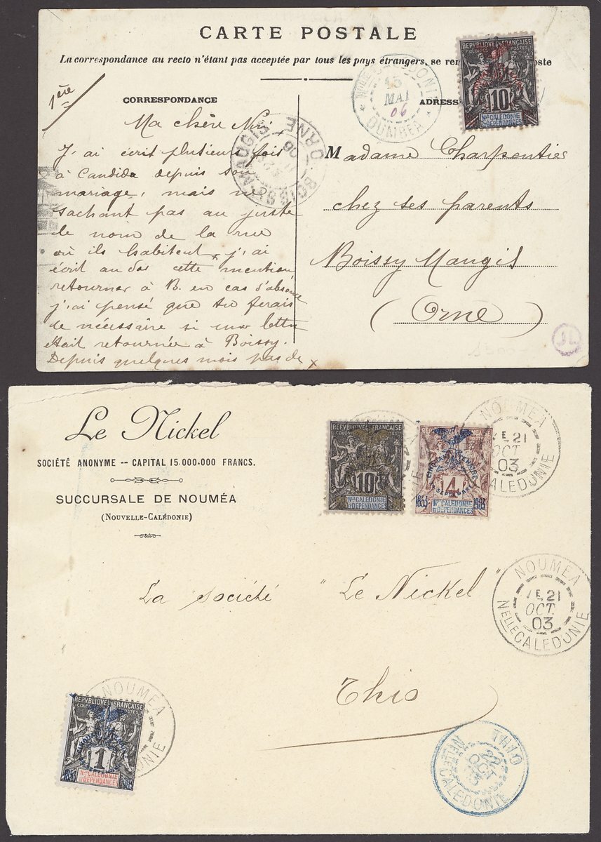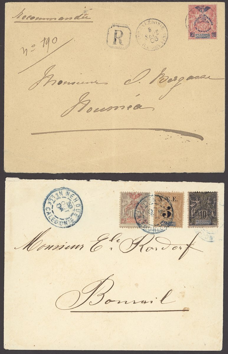 1903-06 Postal History selection (5) including 1906 (4 July) local registered envelope franked 40c. with Noumea cancellation; 1906 (8 Sept.) envelope registered to Noumea franked 50c. with small village Nlle. Caledonie/Ile des Pins cancellation. A very difficult group to assemble.