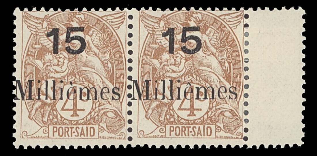 1921-23 15m. on 4c. brown, lightly mounted pair with interpanneau margin, the second stamp with "ê" instead of "è" in Milliemes, Yvert 43c, €230+