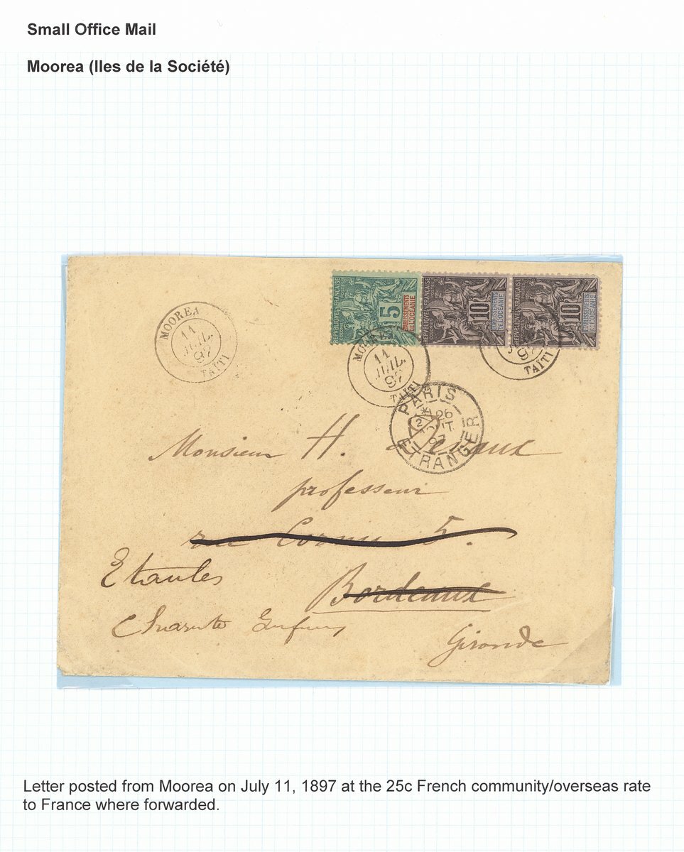 Moorea (Iles de la Société): 1897 (11 July) envelope to Bordeaux, re-directed to Gironde, franked 5c., 10c. (2) with Moorea/Taiti cancellations, Paris/Etranger transit on the front, transit and arrival markings on reverse; fine and a rare letter from this small office sent at the French community overseas rate