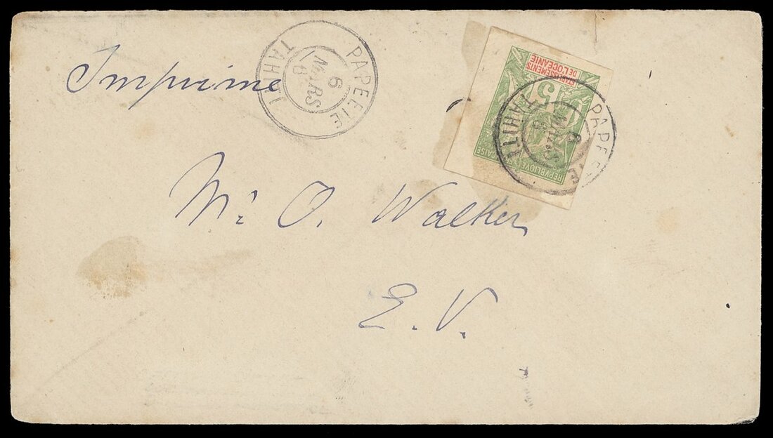 1906 (6 March) local Papeete envelope franked by a "cut out" from a 5c. postal stationery envelope, the use of which was authorised from 5-8 March owing to the current 5c. stamps being destroyed by flooding of the Post Office; a little stained which is most likely natural. A very rare cover.