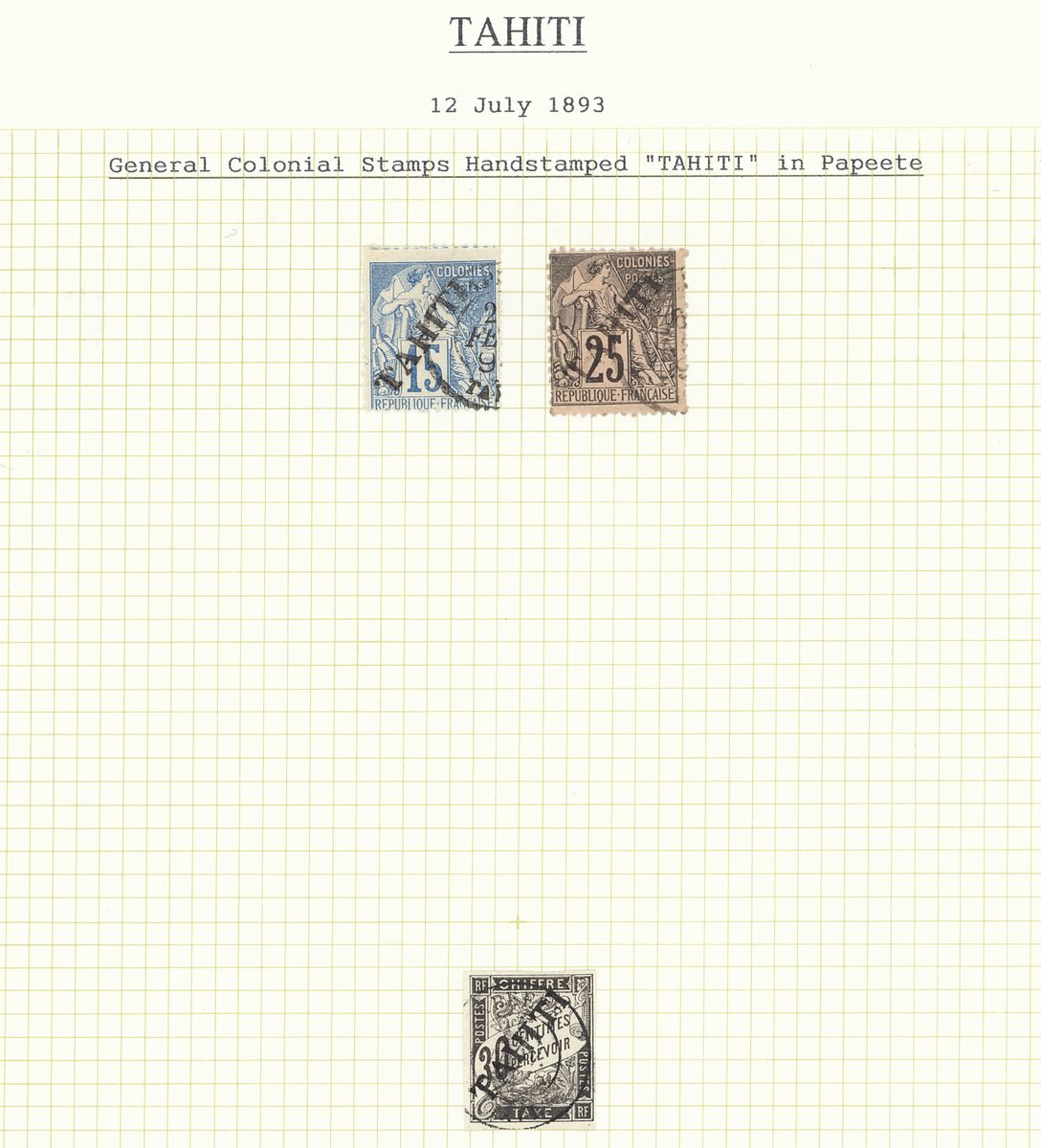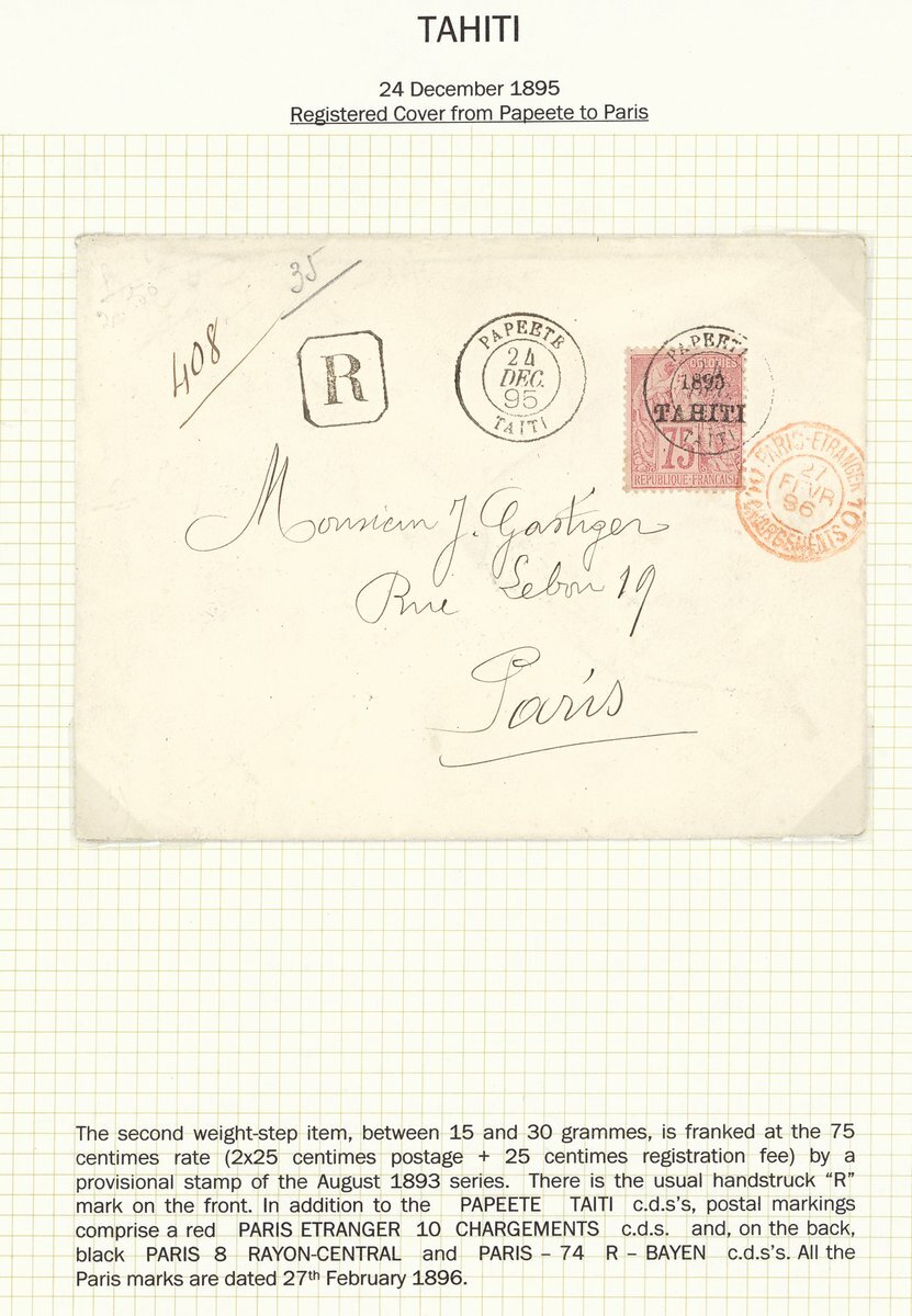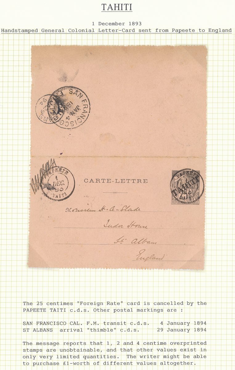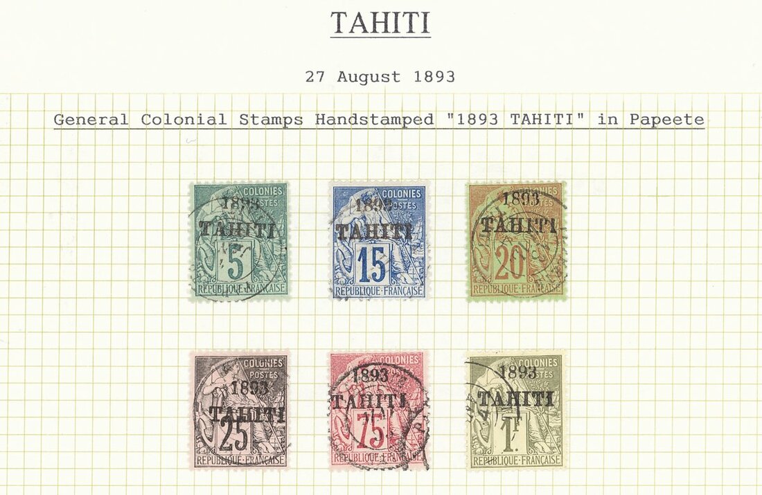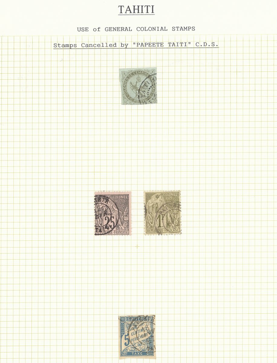 1860s-1893 small collection of used stamps starting with General issues used in Tahiti, some 1893 overprints including a 75c. (S.G. 42) on registered "Gastiger" cover to Paris, and a 25c. lettercard to England via San Francisco with interesting content claiming that 1c.,2c. and 4c. are unobtainable and that other values exist in only very limited quantities, an unusual group worth a direct inspection .