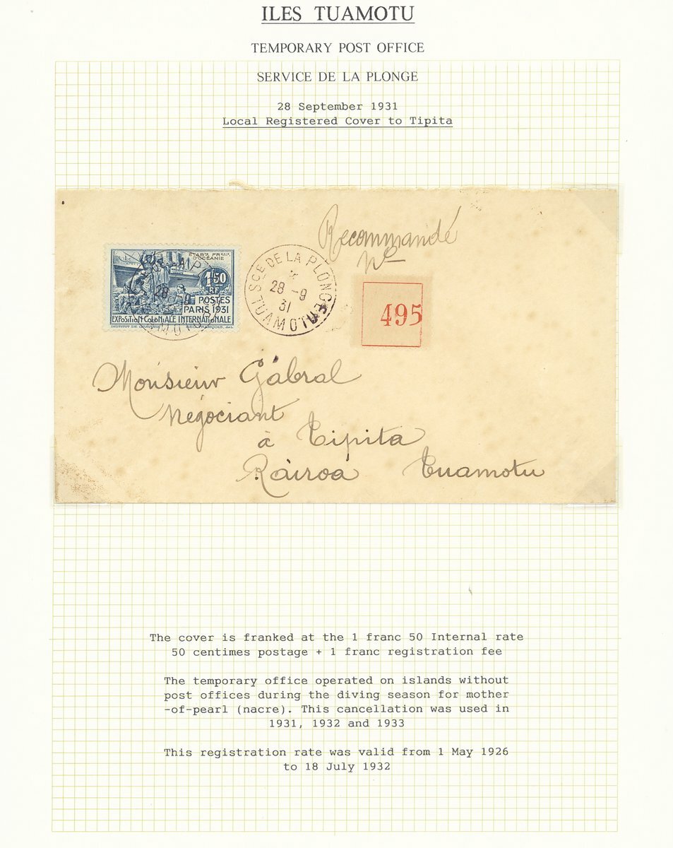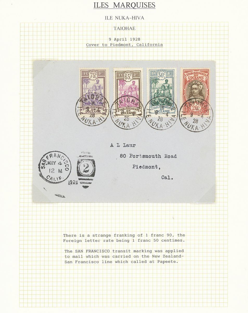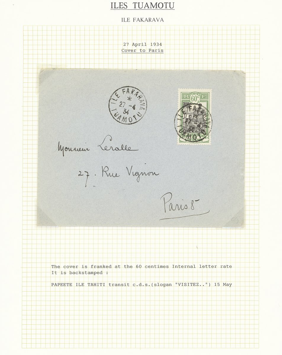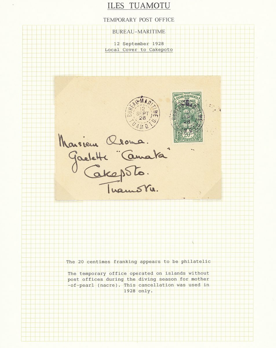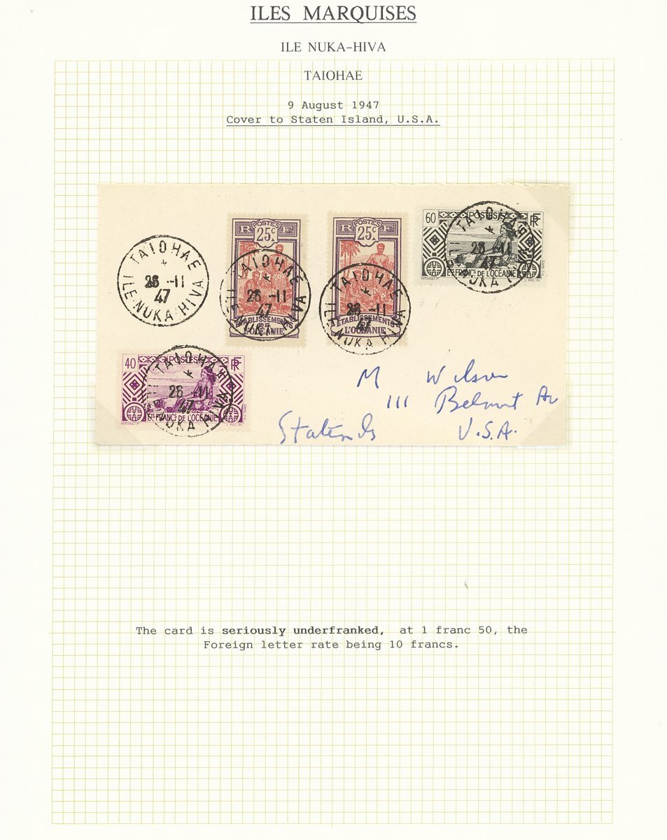 1919-53 Postal History selection on well written up pages with many different offices including "Ile Rapa", "Ile Hiva-oa", "Ile Nuka-Hiva", "Ile Fakarava", "Ile Makatea", "Ile Moorea", "Ile Tahiti", "Ile Bora-Bora", "Ile Raiatea", also Temporary Post Office "Service de la Plonge", New Hebrides Paquebot, Christmas Island and a 1930 receipt for Money Orders from "Ile Tahiti Taravo". A very delightful selection, difficult to assemble .