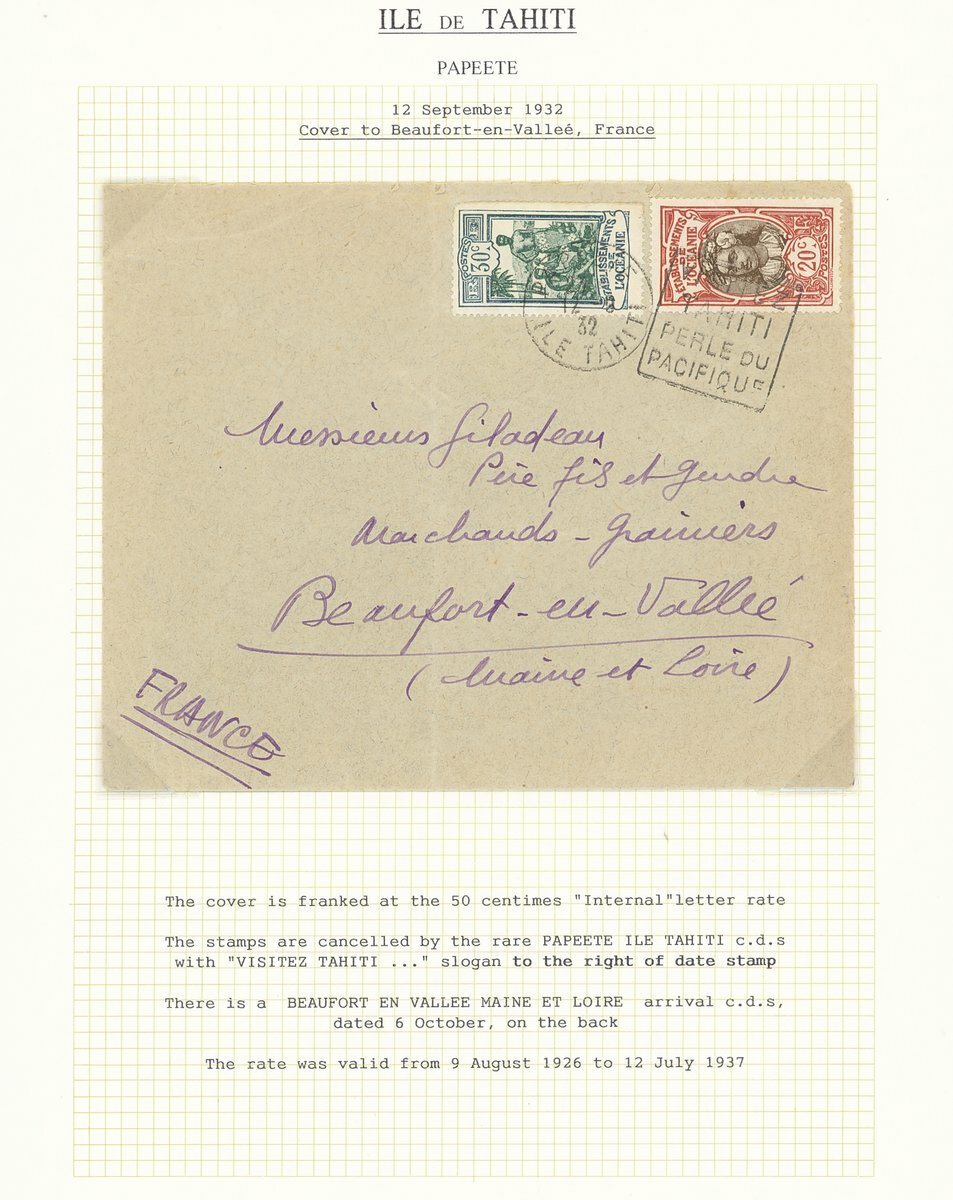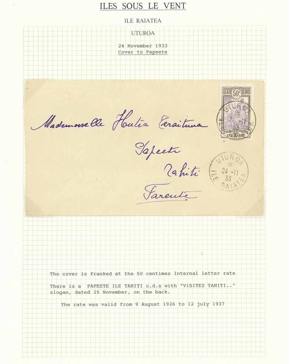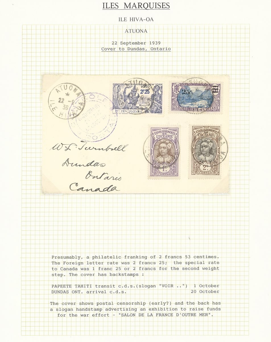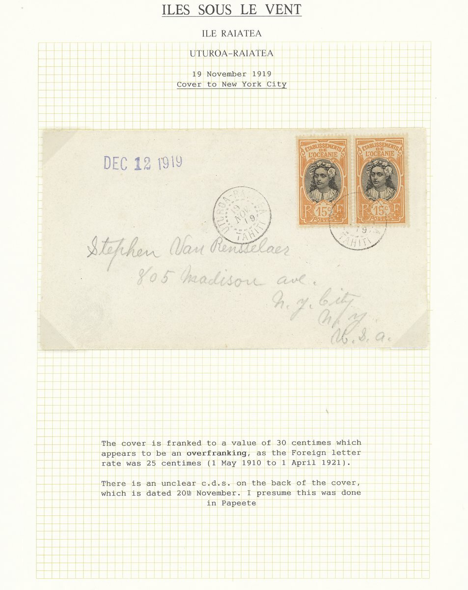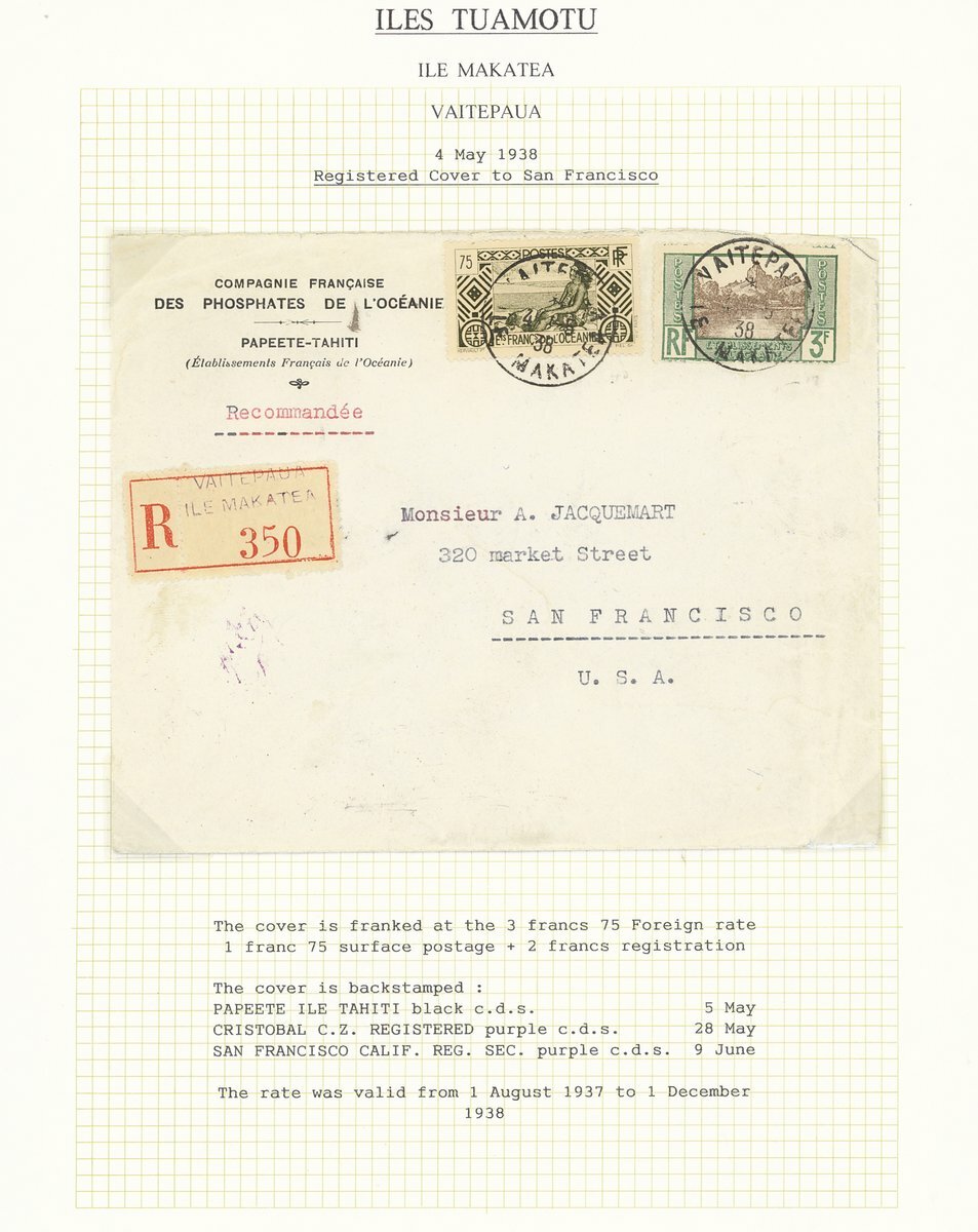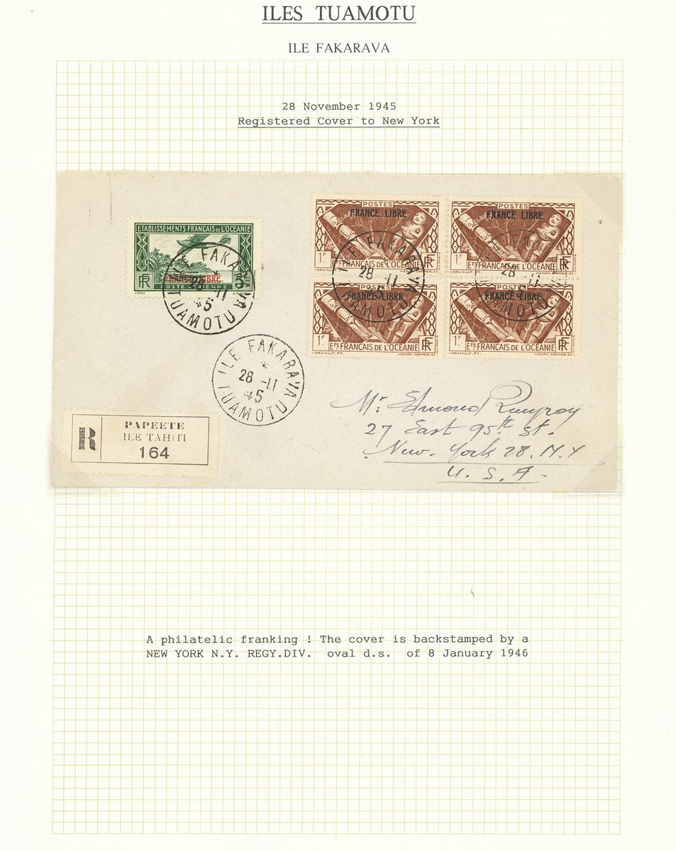1919-53 Postal History selection on well written up pages with many different offices including "Ile Rapa", "Ile Hiva-oa", "Ile Nuka-Hiva", "Ile Fakarava", "Ile Makatea", "Ile Moorea", "Ile Tahiti", "Ile Bora-Bora", "Ile Raiatea", also Temporary Post Office "Service de la Plonge", New Hebrides Paquebot, Christmas Island and a 1930 receipt for Money Orders from "Ile Tahiti Taravo". A very delightful selection, difficult to assemble .