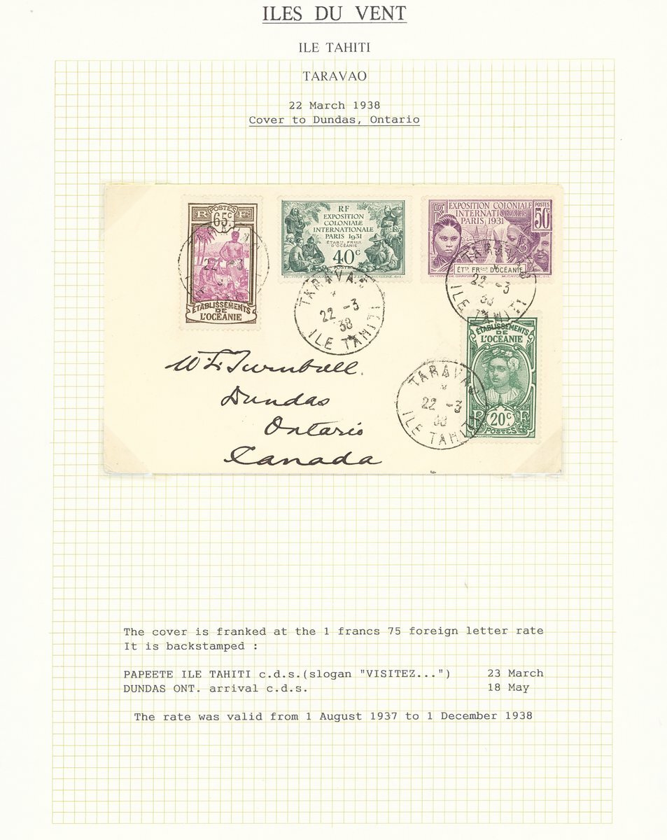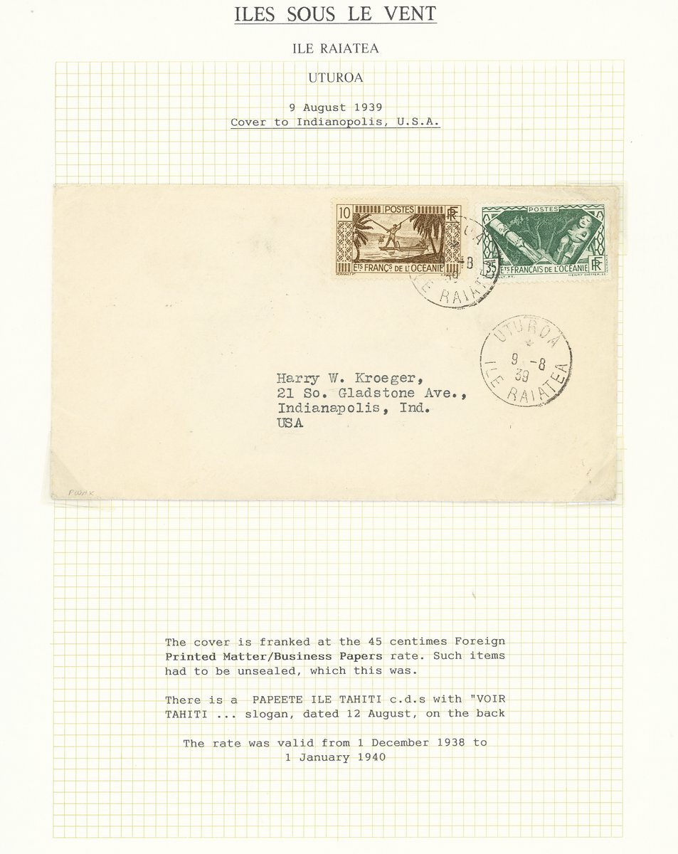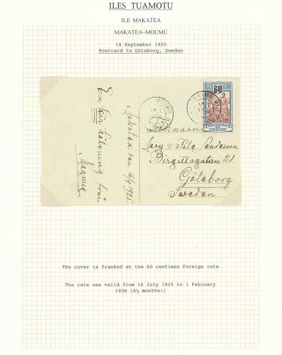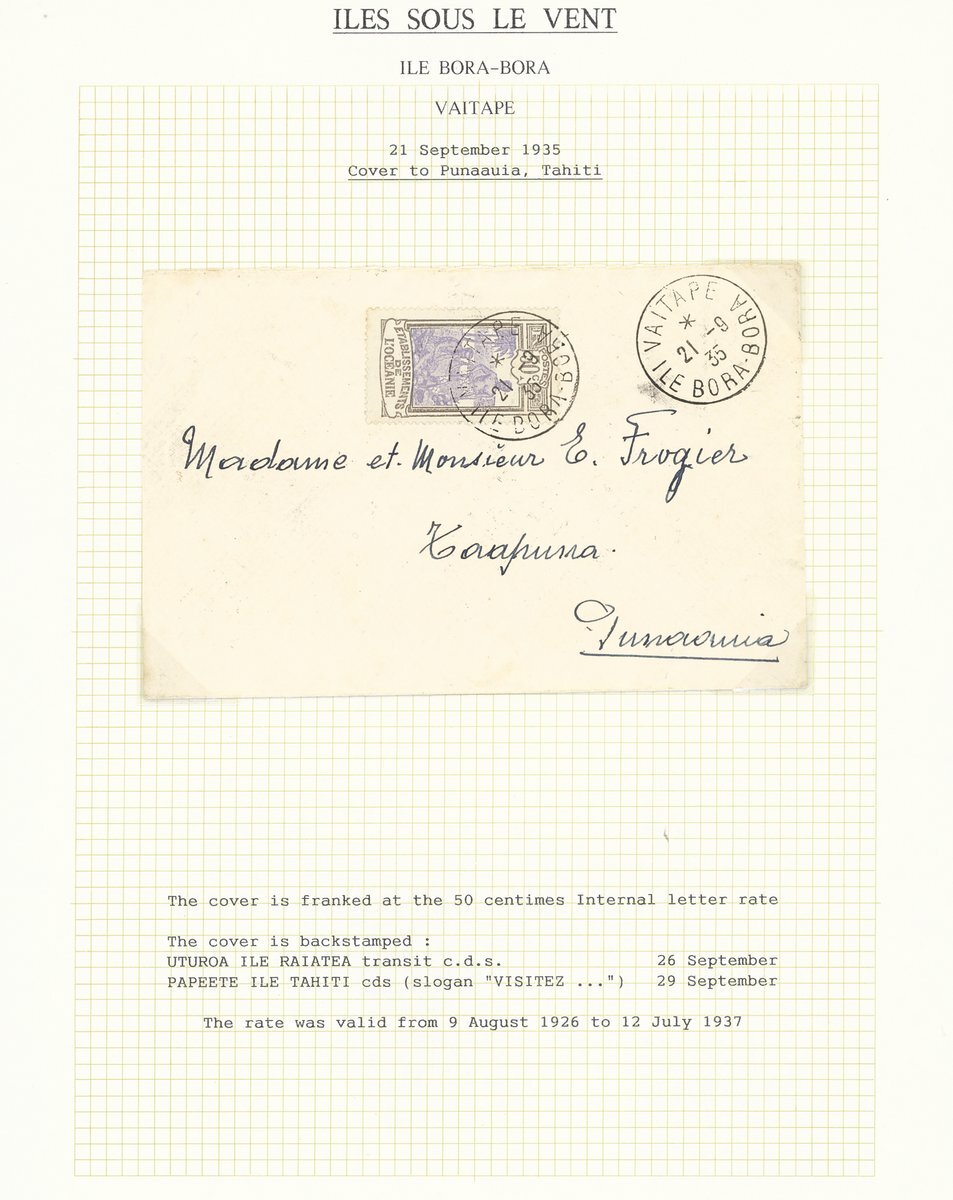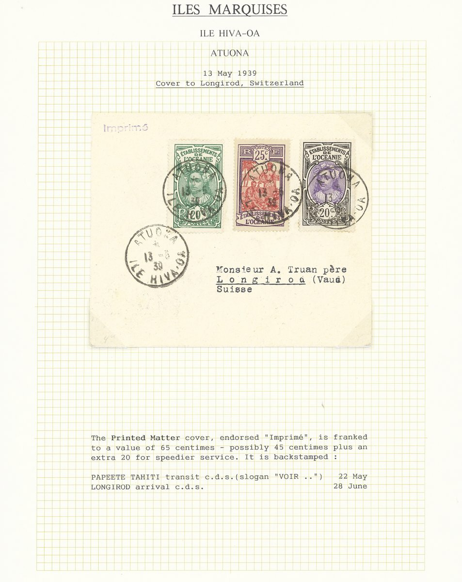 1919-53 Postal History selection on well written up pages with many different offices including "Ile Rapa", "Ile Hiva-oa", "Ile Nuka-Hiva", "Ile Fakarava", "Ile Makatea", "Ile Moorea", "Ile Tahiti", "Ile Bora-Bora", "Ile Raiatea", also Temporary Post Office "Service de la Plonge", New Hebrides Paquebot, Christmas Island and a 1930 receipt for Money Orders from "Ile Tahiti Taravo". A very delightful selection, difficult to assemble .