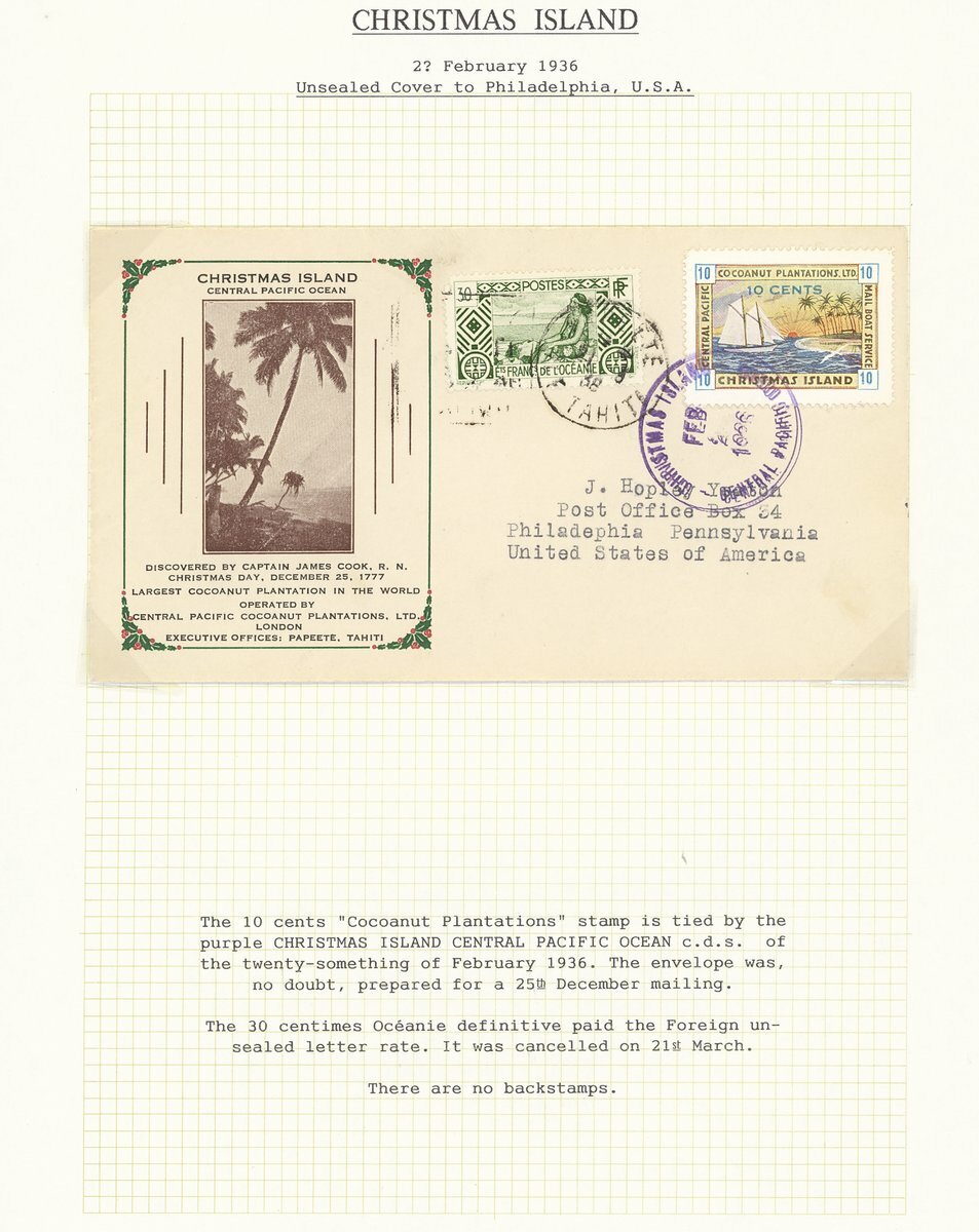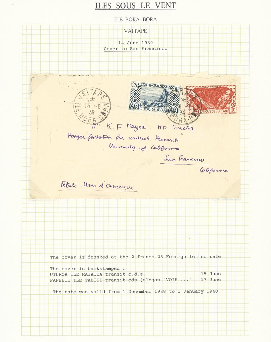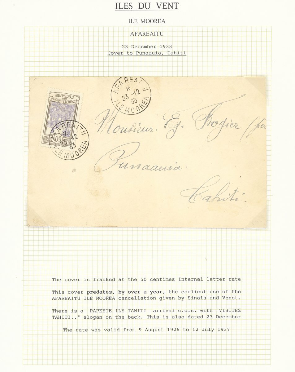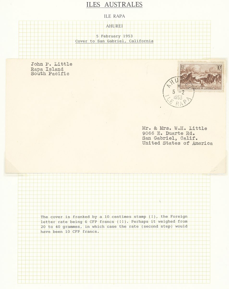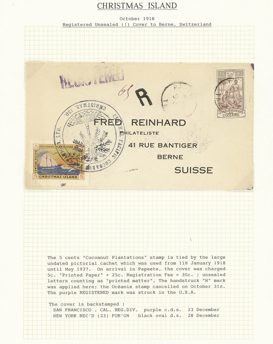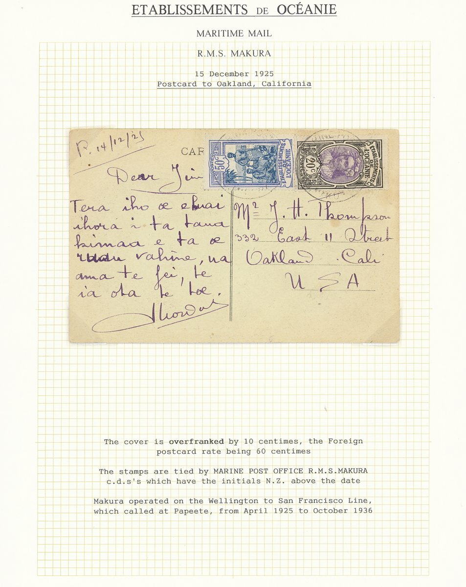 1919-53 Postal History selection on well written up pages with many different offices including "Ile Rapa", "Ile Hiva-oa", "Ile Nuka-Hiva", "Ile Fakarava", "Ile Makatea", "Ile Moorea", "Ile Tahiti", "Ile Bora-Bora", "Ile Raiatea", also Temporary Post Office "Service de la Plonge", New Hebrides Paquebot, Christmas Island and a 1930 receipt for Money Orders from "Ile Tahiti Taravo". A very delightful selection, difficult to assemble .