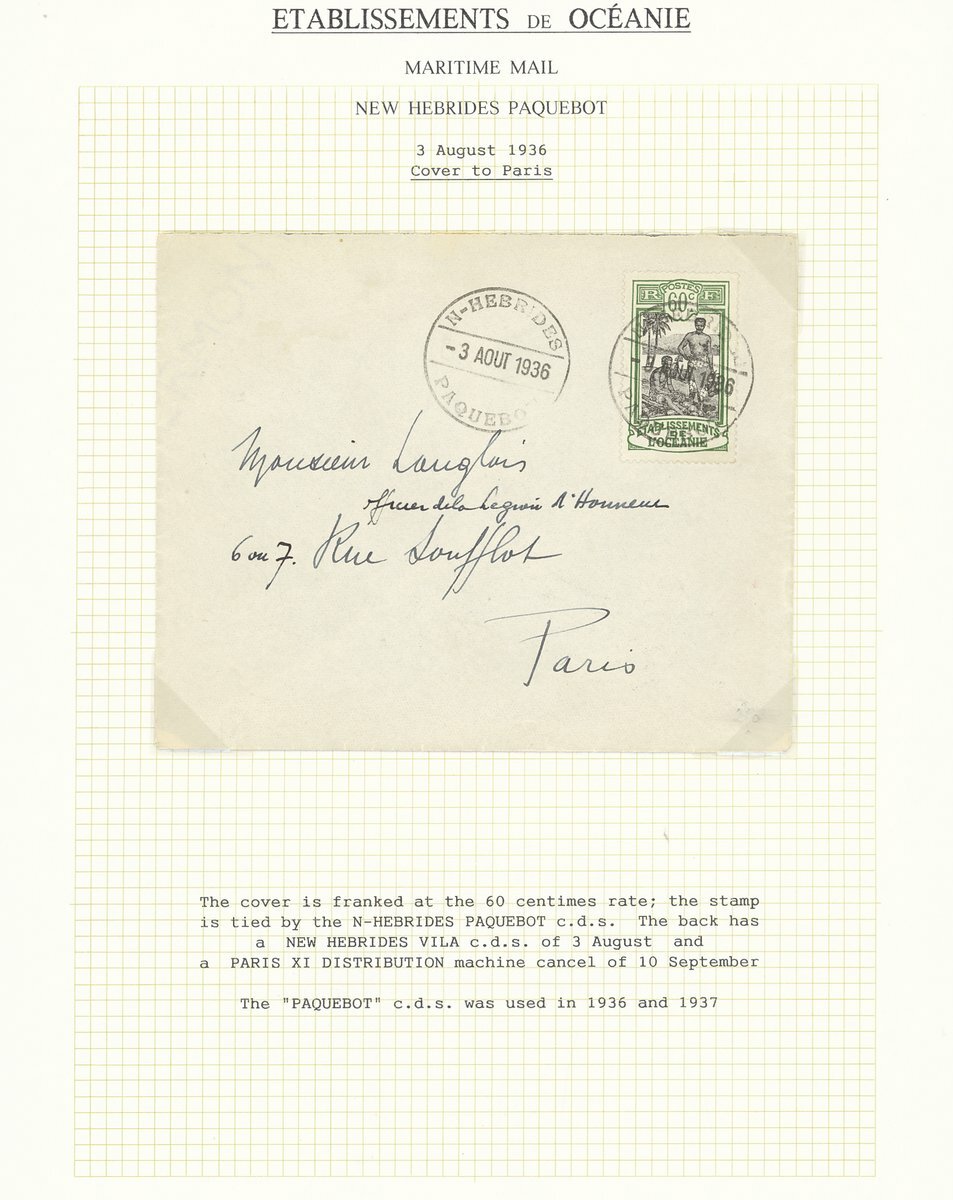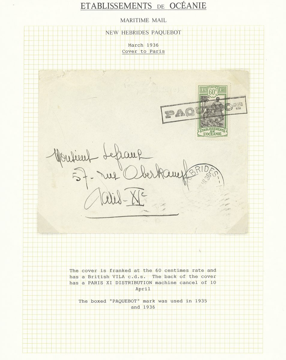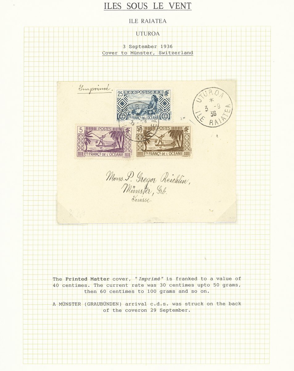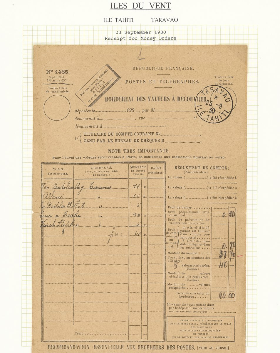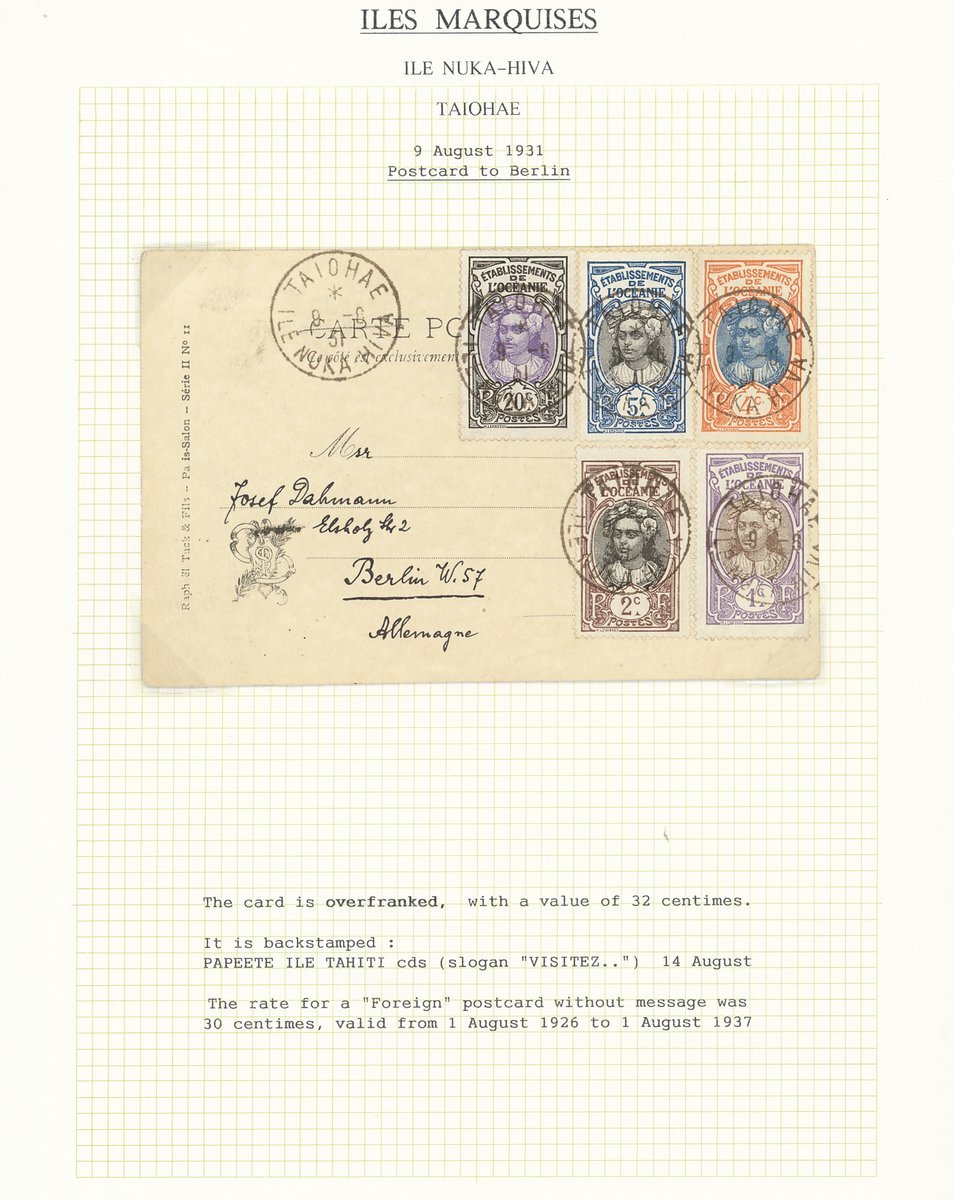 1919-53 Postal History selection on well written up pages with many different offices including "Ile Rapa", "Ile Hiva-oa", "Ile Nuka-Hiva", "Ile Fakarava", "Ile Makatea", "Ile Moorea", "Ile Tahiti", "Ile Bora-Bora", "Ile Raiatea", also Temporary Post Office "Service de la Plonge", New Hebrides Paquebot, Christmas Island and a 1930 receipt for Money Orders from "Ile Tahiti Taravo". A very delightful selection, difficult to assemble .