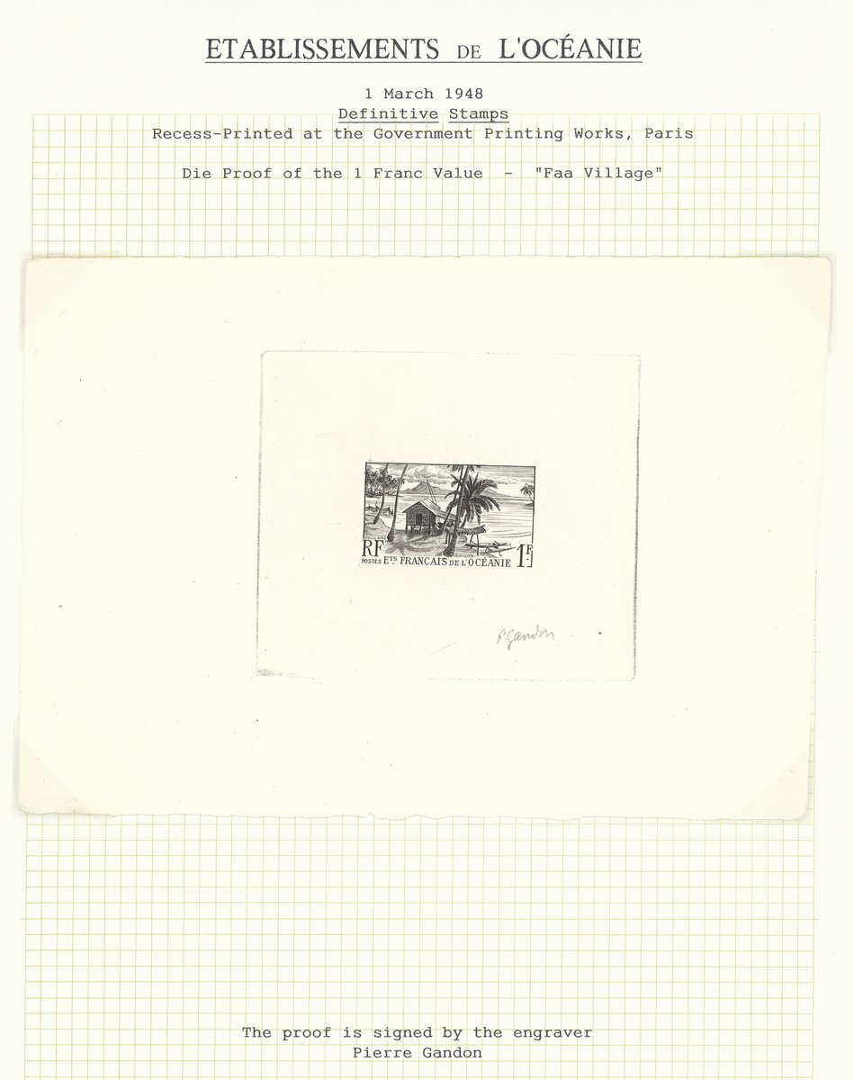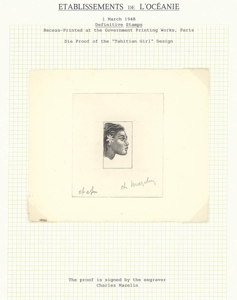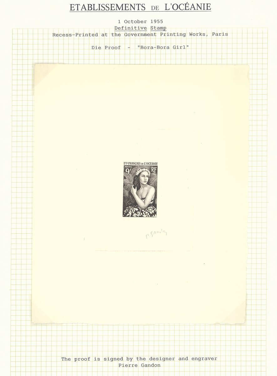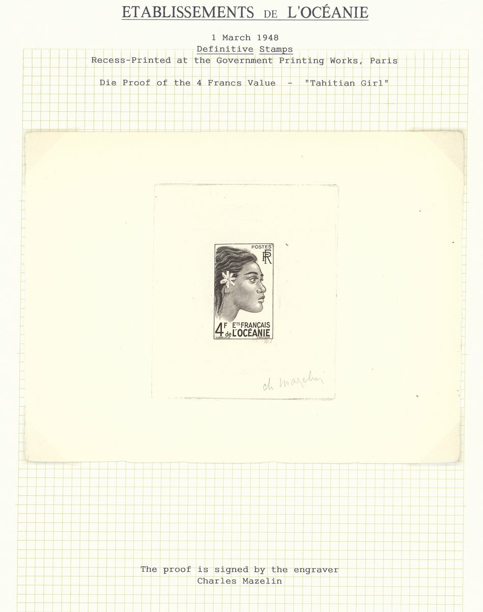 1948-55 issue, five different proofs, each signed by the engraver (Pierre Gardon or Charles Mazelin) including "Faa Village" 1f., "Faa Village" 1f.20, "Tahitian Girl" design only, "Tahitian Girl" 4f., "Bora-Bora Girl" 9f., a very fine and attractive group .