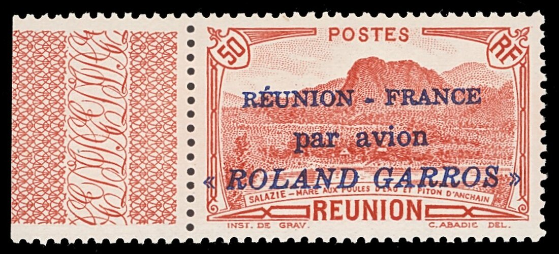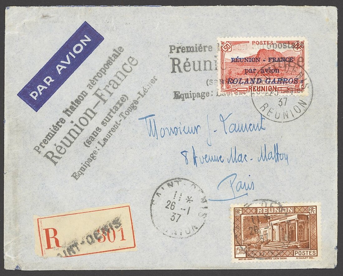 1937 Air 50c. "Roland Garros" duo, an unmounted left marginal stamp and an example (upper right corner rounded) on cover to France with the special cachet "Premiere liason aeropostale/Reunion-France/(sans surtaxe)/Equipage: Laurent-Touge-Lenier". Fine and scarce.