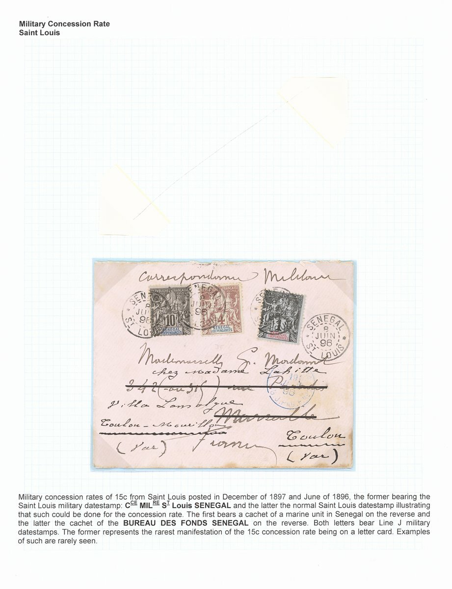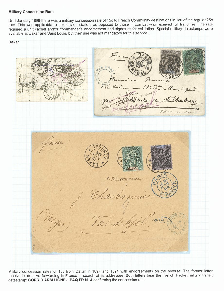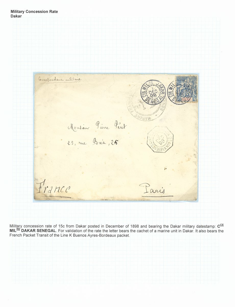1894-1905, eleven covers or cards, including 1896 cover to Cantal franked 15c. with blue Corr D. Arm Lig. J cancellation, 1898 to Paris franked 25c. with Cce MILre DAKAR/SENEGAL cancellation and octagonal Buenos Ayres-Bordeaux packet datestamp, 1898 reply portion of 10c. + 10c. card from Hamburg with octagonal Cor. D. Arm/Paq. Fr No. 5 cancellation and Military cachet, 1898 and 1899 stampless envelopes from St. Louis to Dakar with different Military cachets, etc. chiefly fine.