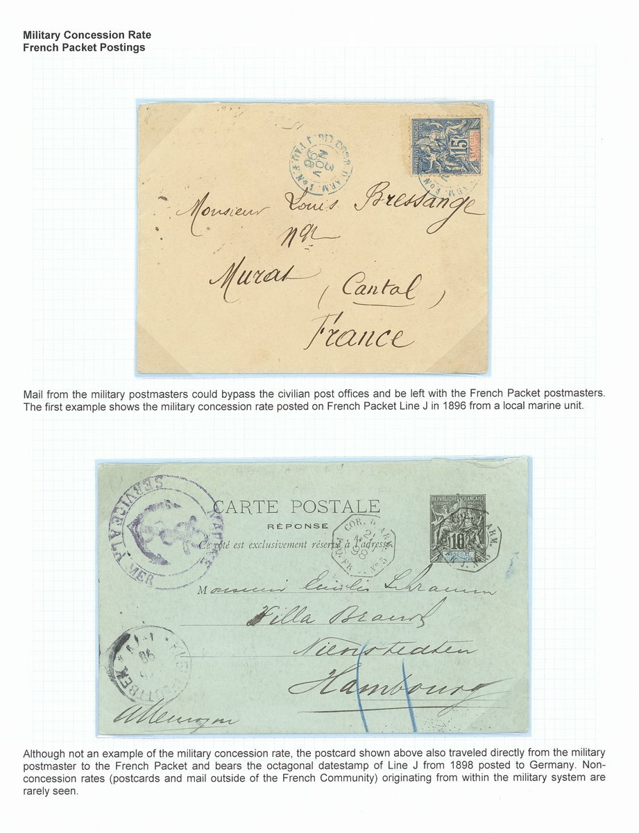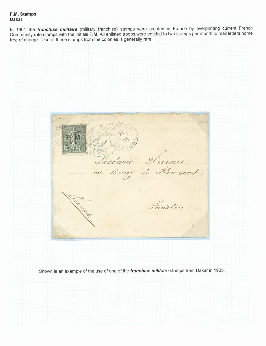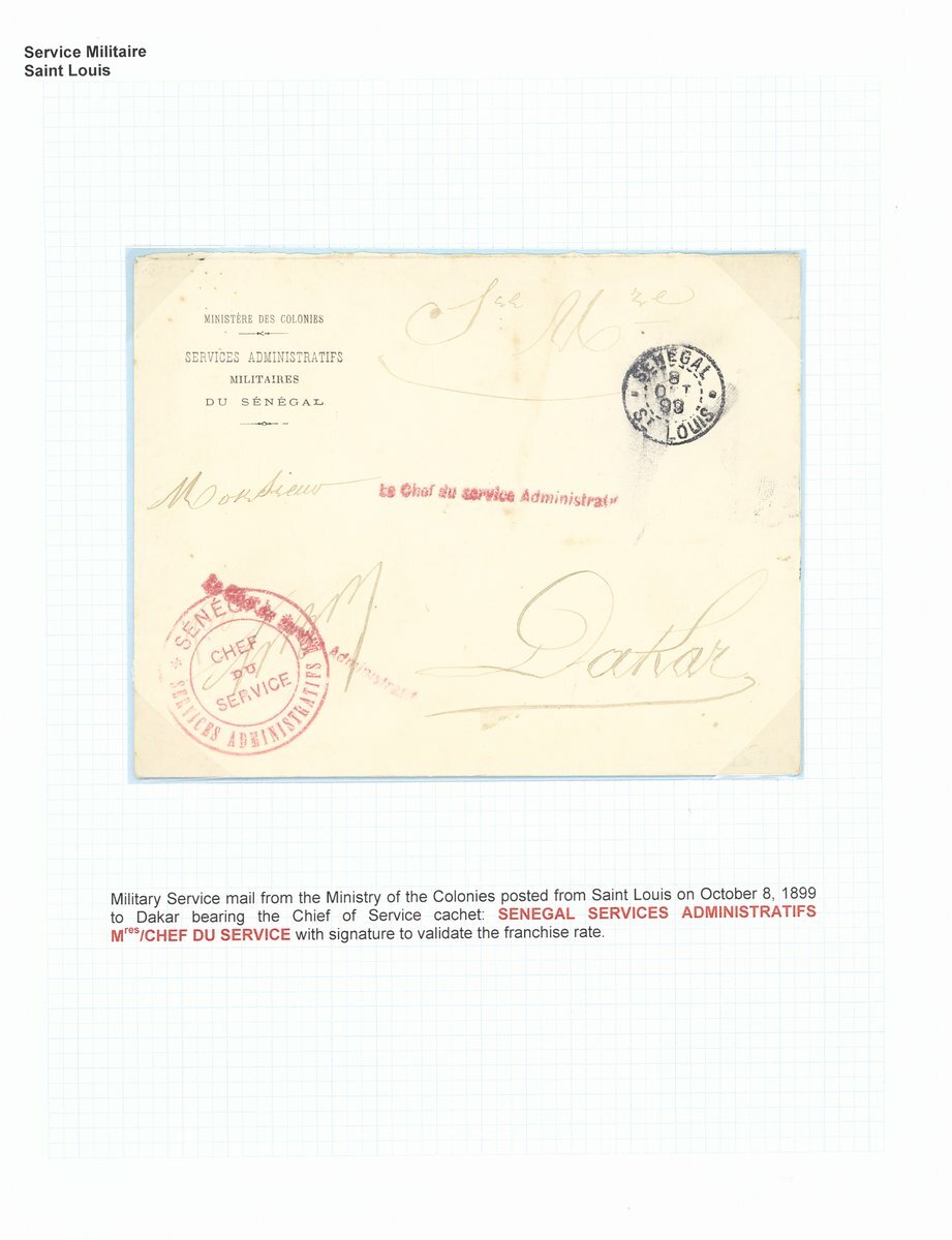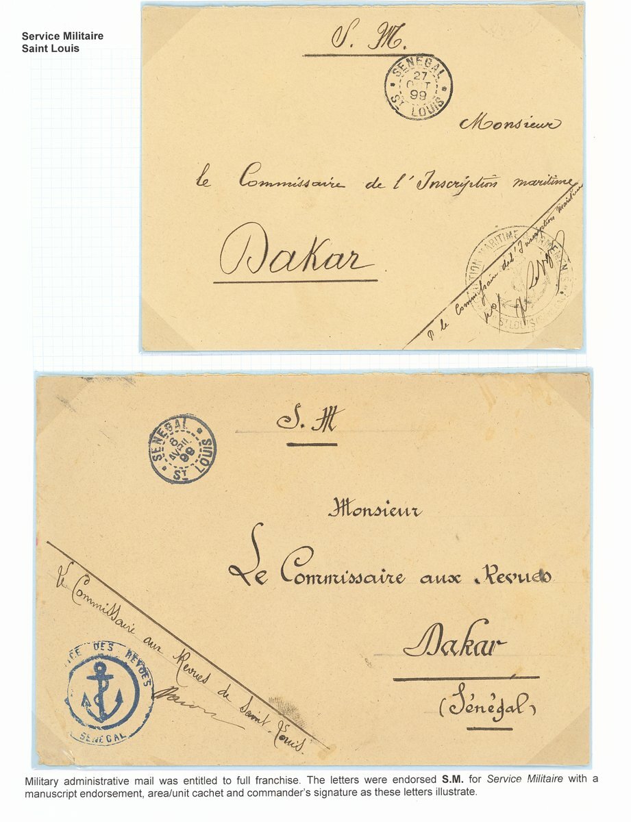 1894-1905, eleven covers or cards, including 1896 cover to Cantal franked 15c. with blue Corr D. Arm Lig. J cancellation, 1898 to Paris franked 25c. with Cce MILre DAKAR/SENEGAL cancellation and octagonal Buenos Ayres-Bordeaux packet datestamp, 1898 reply portion of 10c. + 10c. card from Hamburg with octagonal Cor. D. Arm/Paq. Fr No. 5 cancellation and Military cachet, 1898 and 1899 stampless envelopes from St. Louis to Dakar with different Military cachets, etc. chiefly fine.