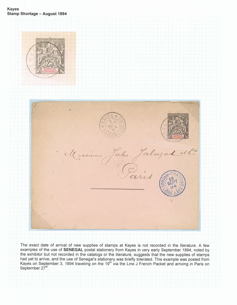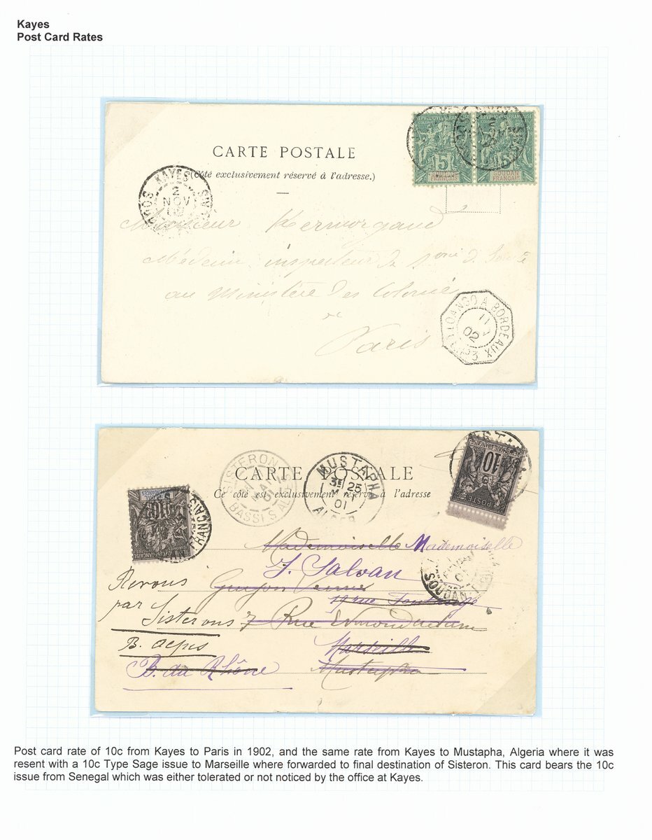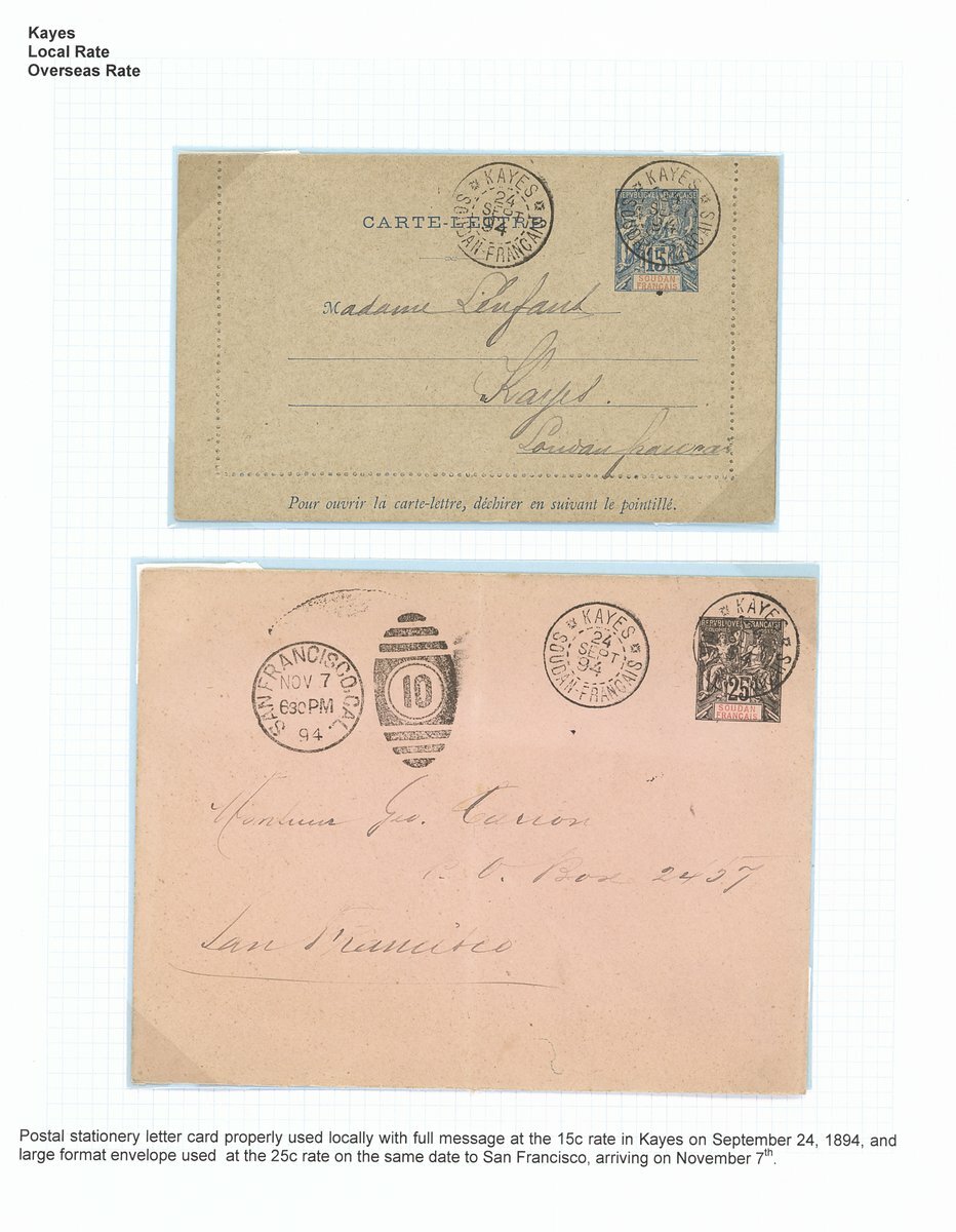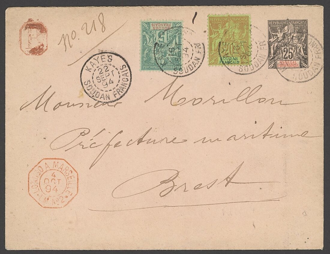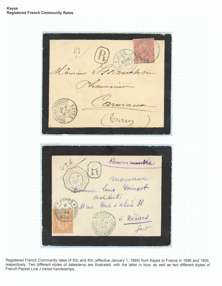 1894-1901 Keyes Postal History selection (10) including 1894 (22 Sept.) Senegal 25c. postal stationery envelope, additionally franked 5c. and 20c., registered to Brest, Kayes/Soudan Francais cancellations and with red octagonal Loango a Marseille/LM No. 2 datestamp below; 1896 (21 March) mourning envelope registered to Carmaux franked with 50c.; 1898 (6 July) stampless envelope to Paris, endorsed "Troup Soudan", Kates/Soudan datestamp and octagonal Buenos Ayres a Bordeaux/LK No. 1 datestamp below.