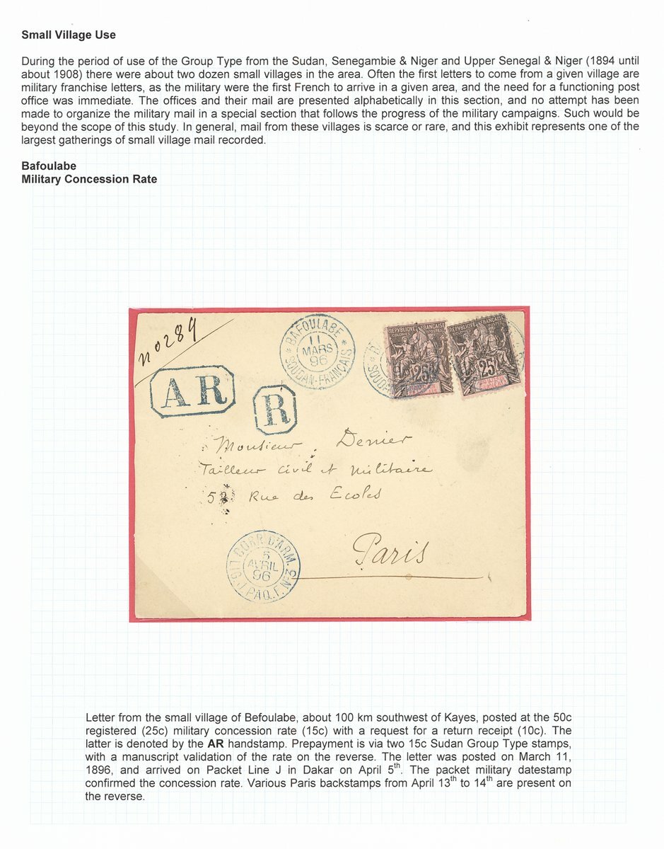 Bafoulabe: 1896 (11 March) "AR" envelope registered to Paris, franked 25c. (2) with blue Bafoulabe/Soudan Francais cancellations, with blue Corr D'Arm./Lig J Paq. F. No. 3 alongside, endorsed on reverse Correspondence militaire, fine and rare use of the Military concession rate from a small Village .