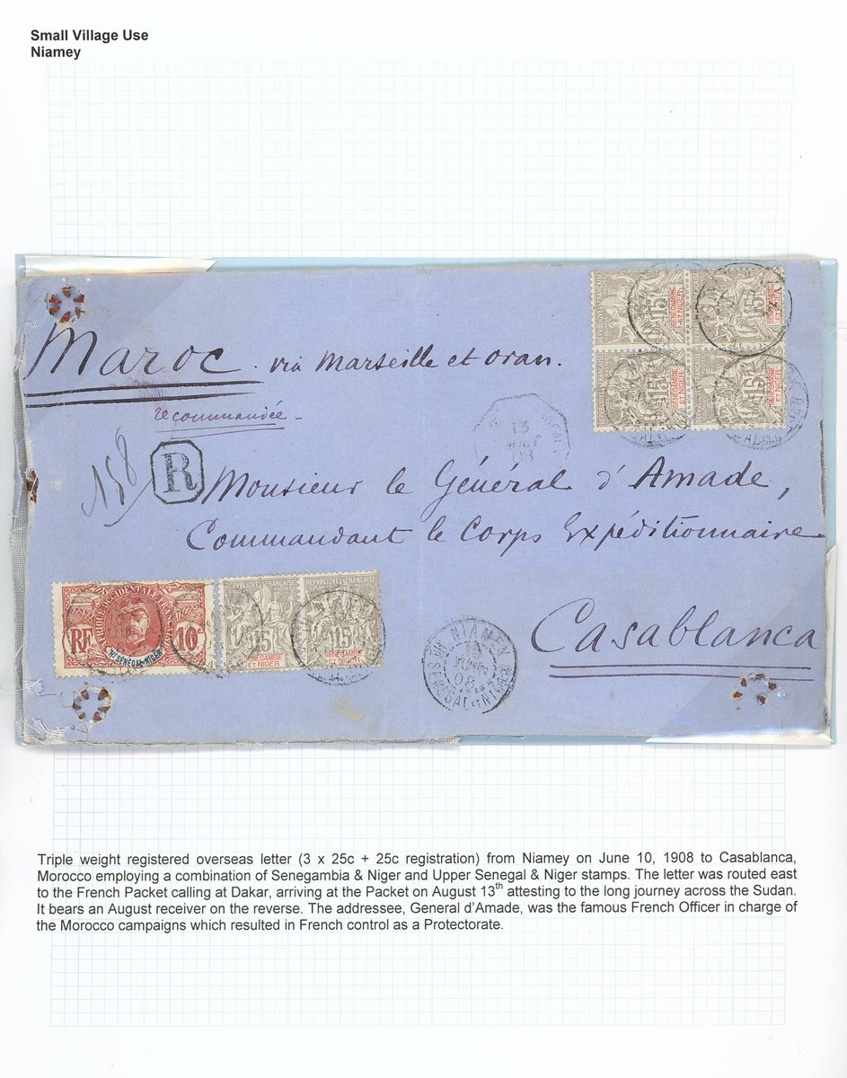 Niamey: 1908 (10 June) large linen lined envelope, registered to Monsieur le Général d'Amade Commandant le Corps Expéditionaire Casablanca franked 15c. pair, block of four and Faidherbe 10c. with Niamey/Ht Senegal et Niger cancellations; vertical filing fold clear of the adhesives. An unusual franking