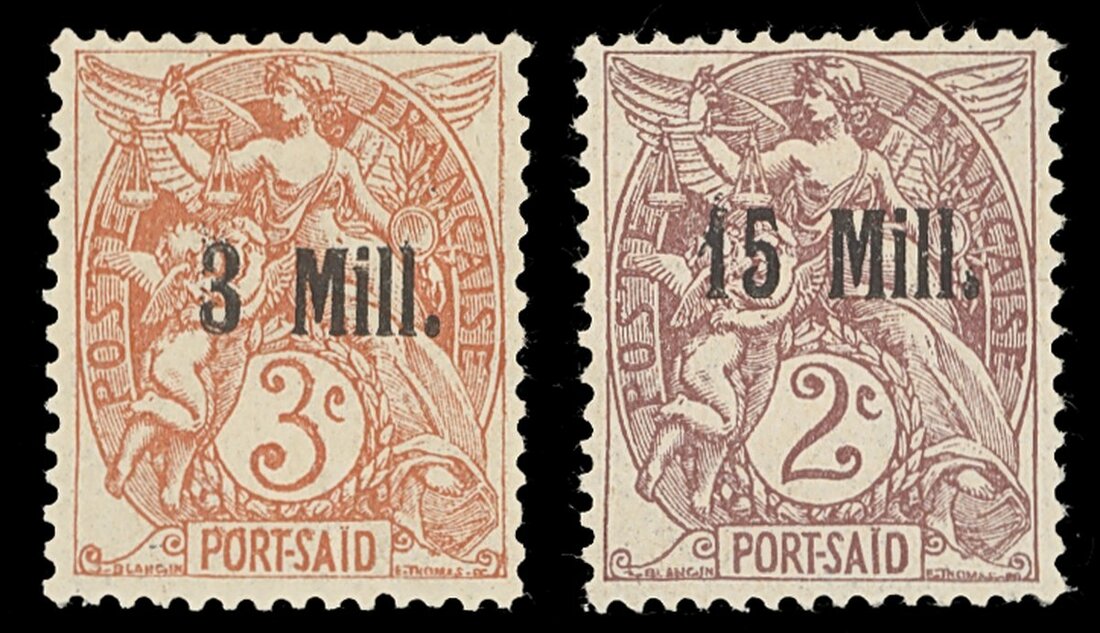 1921-23 3m. on 3c. orange and 15m. on 2c. brown-lilac, both error of surcharge, surcharged on Port Said stamps P>; mint large part original gum, fine, Yvert 36b, 44a, €370