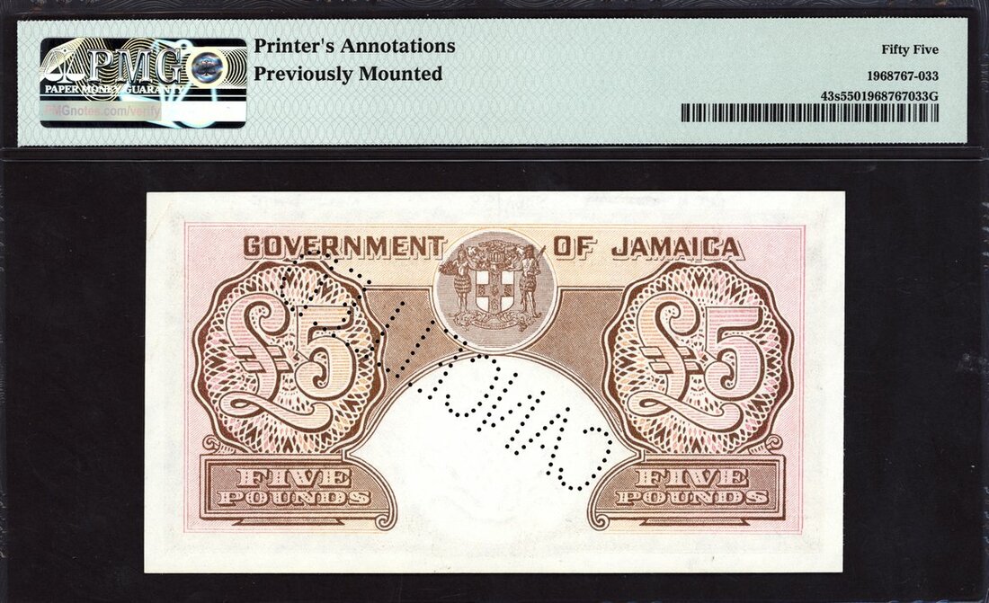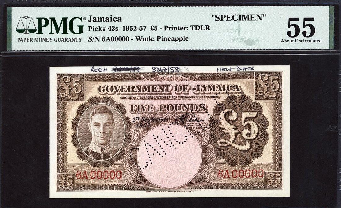 Government of Jamaica, specimen £5, 1 September 1957, red serial number 6A 00000, dark and light brown and pink, George VI at left, value at right, signature of Robert Newton, reverse pink and brown, value at left and right, arms top centre