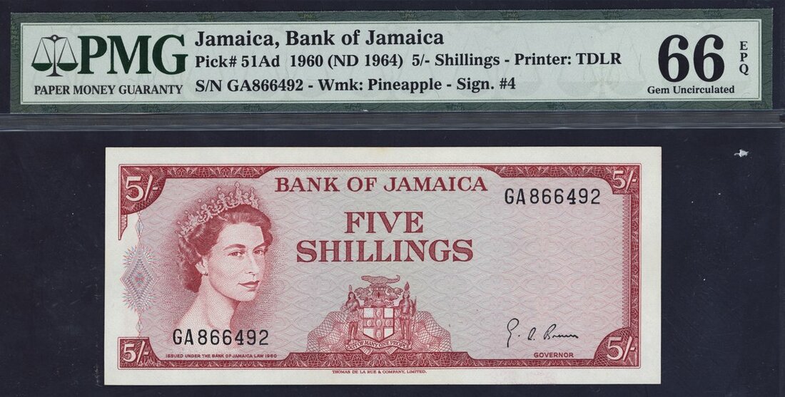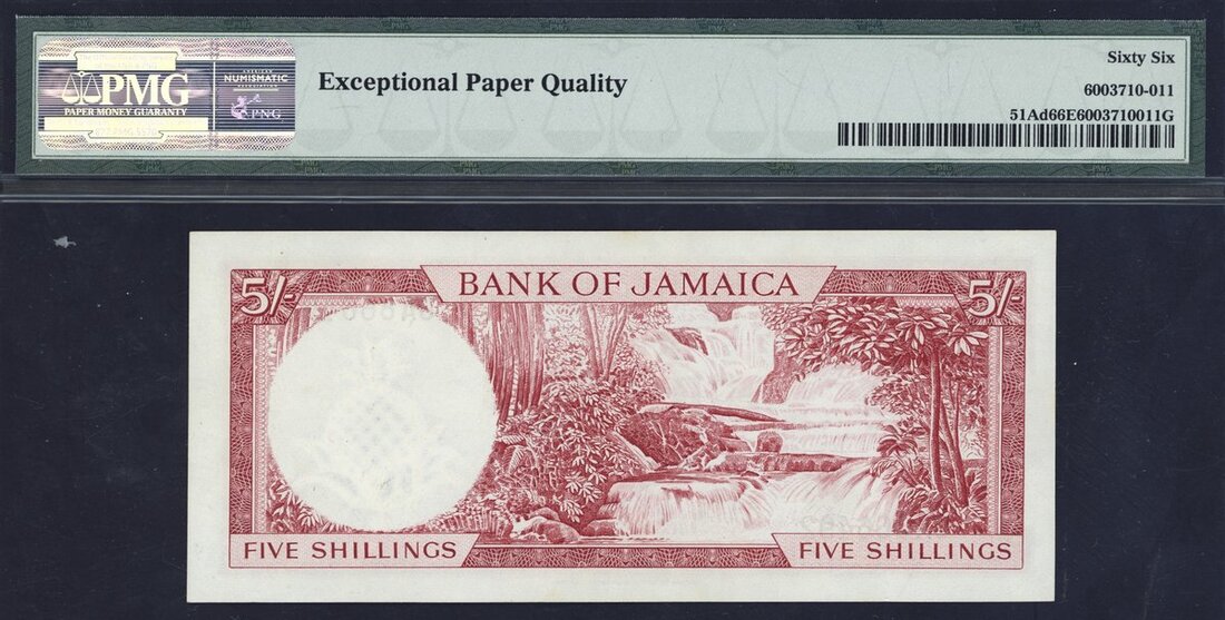 (x) Bank of Jamaica, 5 shillings, ND (1964), serial number OA 866492, red and multicoloured, Elizabeth II at left