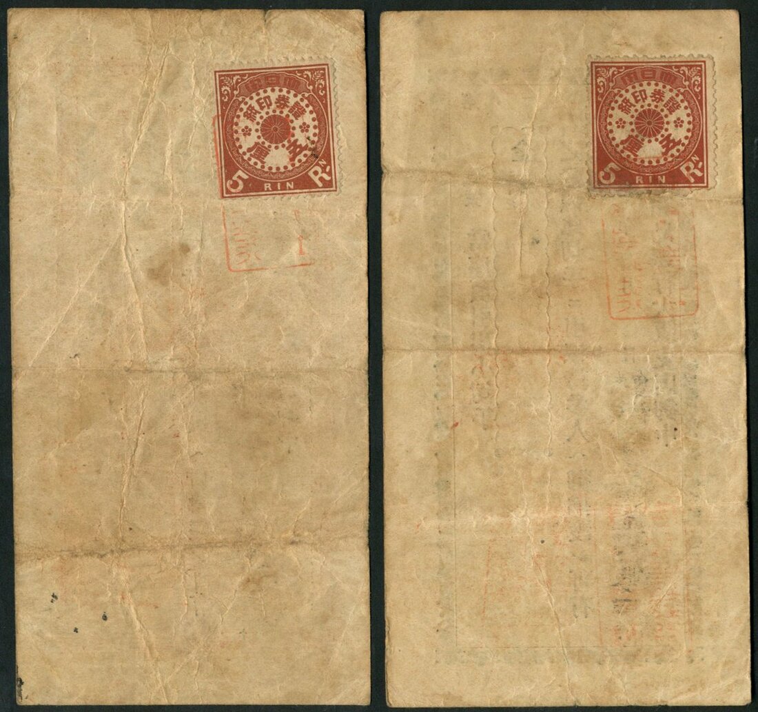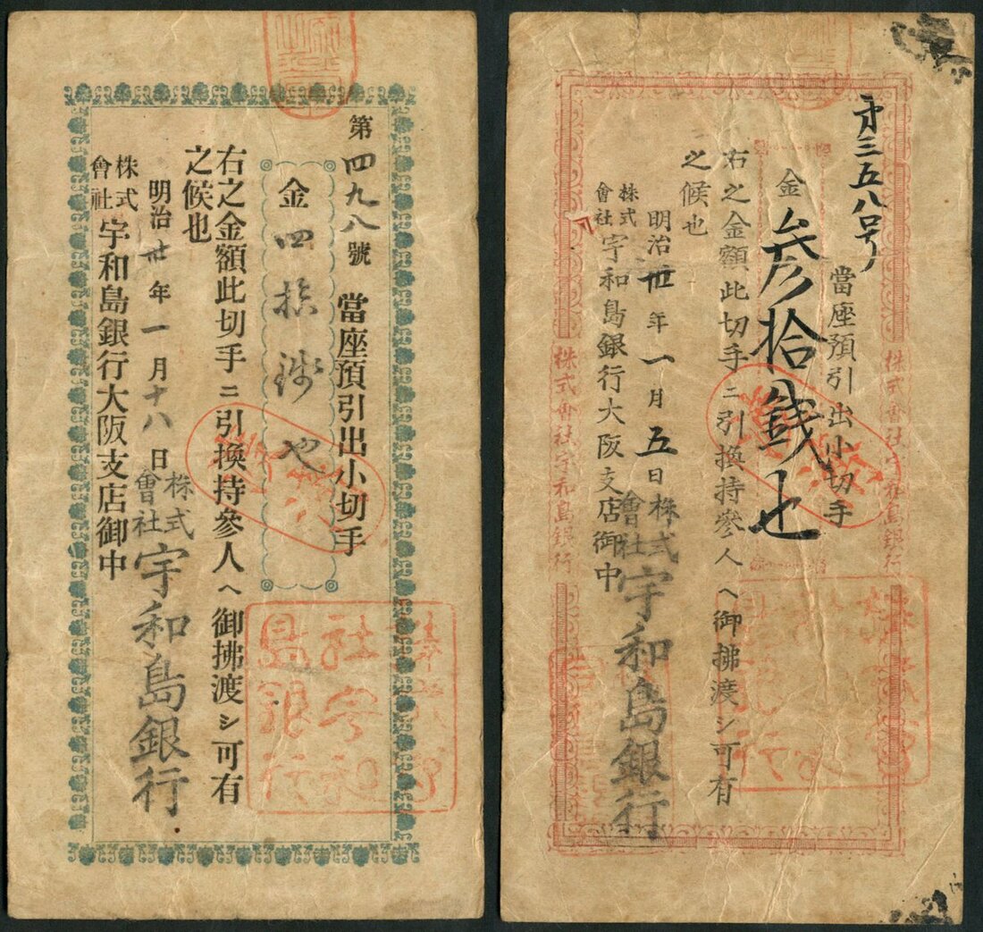 (x) Uwajima Bank, Japan private issues, 30, 40 sen, 1897 (Meiji year 4), (Pick unlisted, IBNS78, 79), about very fine, stamp at obverse, 5 rin stamp cancelled at reverse, rare and interesting (2 notes)