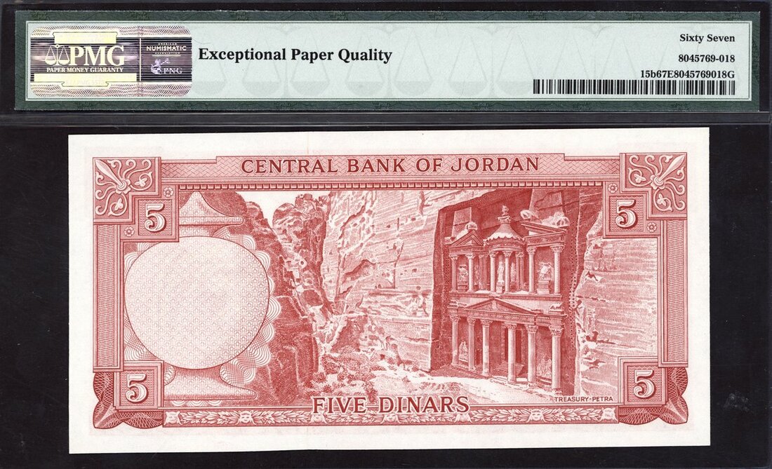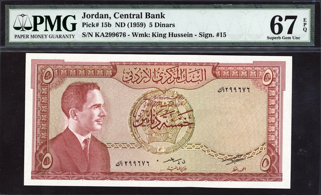 (x) Central Bank of Jordan, 5 dinars, ND (1959), serial number , red, King Hussein at left, reverse green, great treasury at Petra