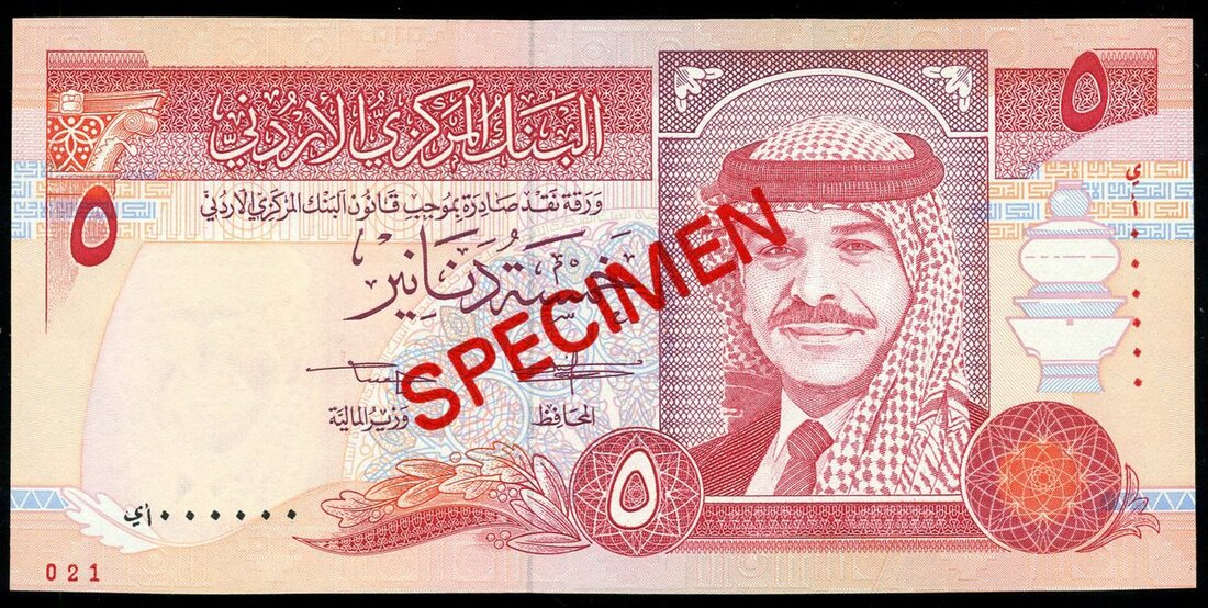 (x) Central Bank of Jordan, specimen 5 dinars, 1993, black zero serial numbers, red, King Hussein at right