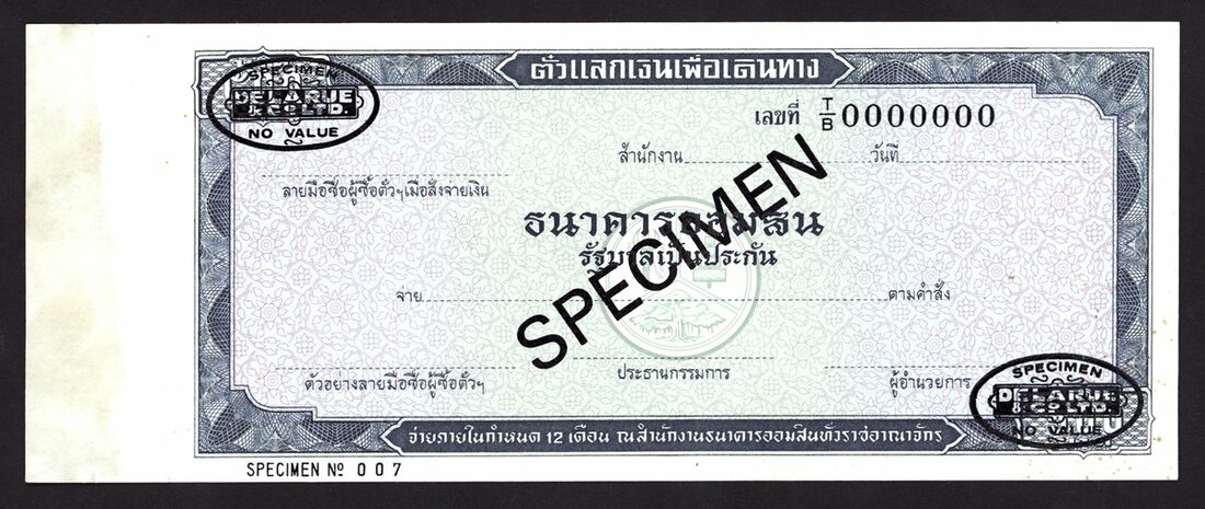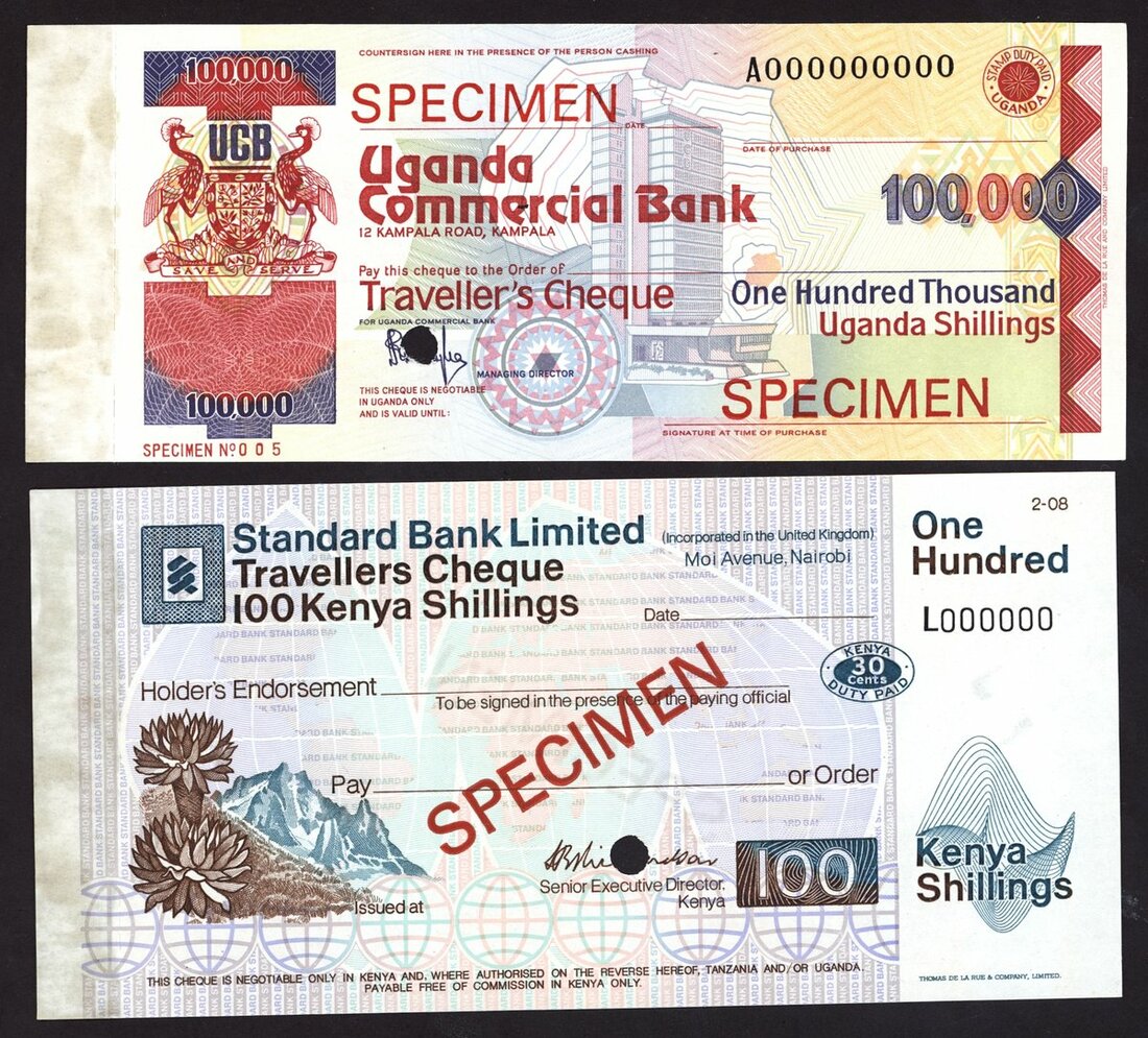 De La Rue Specimen travellers' cheques from 1980, Cambodia, Kenya and Uganda,
