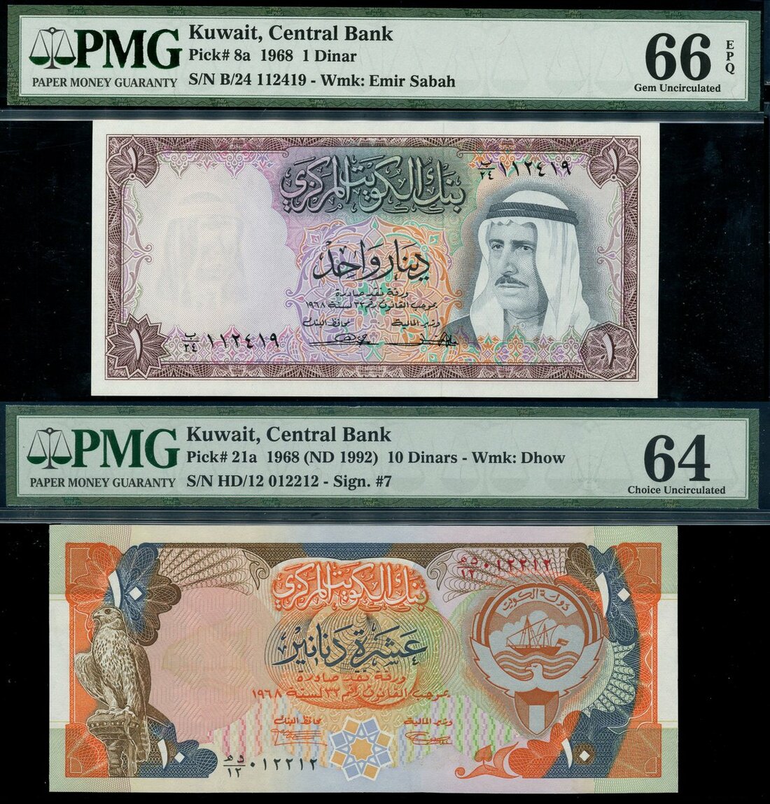(x) Central Bank of Kuwait, 1 dinar, 1968, prefix B/24, brown- purple and multicoloured, portrait of Amir Shaikh Sabah at right, signatures of Abbas and Al-Atiqi, also 10 dinars, 1992, prefix HD/12, orange and multicoloured