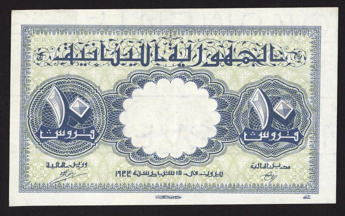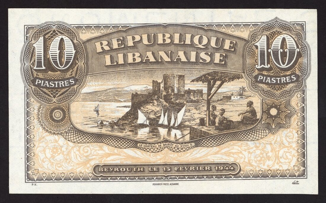 Republique Libanaise, 10 piastres, 15 February 1944, blue and pale green, reverse brown, shoreline