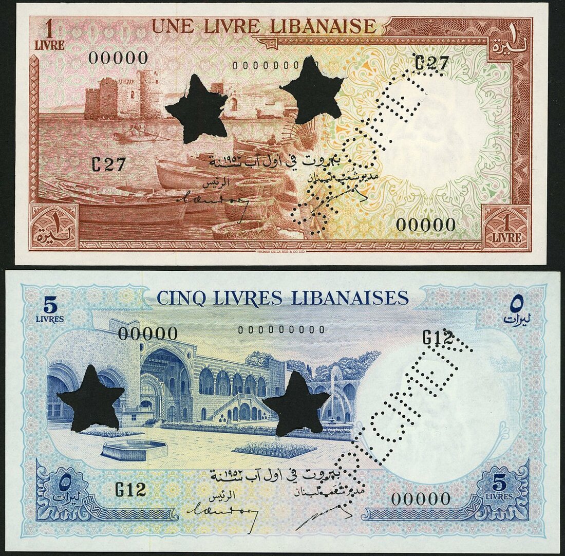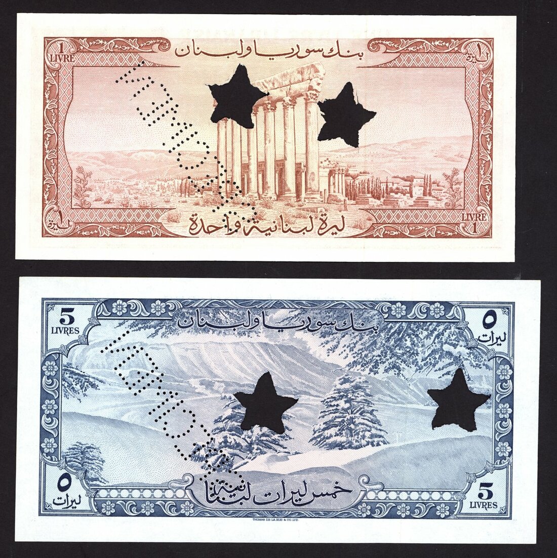 Banque de Syrie et du Liban, Lebanon, specimen 1 livre, 1952, serial number prefix C27, brown, Crusader castle at Saida, also specimen 5 livres, 1952, prefix G12, blue, the palace courtyard at Beit-ed Din