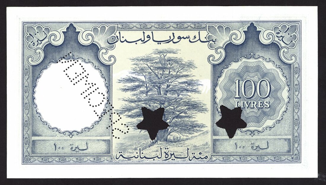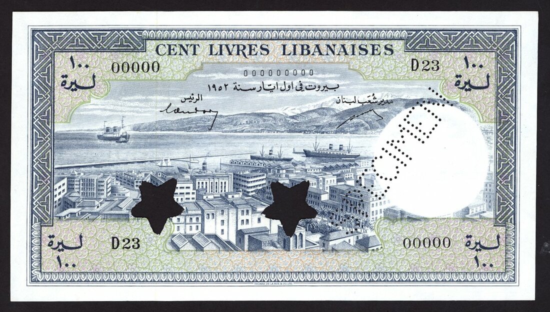 Banque de Syrie et du Liban, Lebanon, specimen 100 livres, 1952, serial number D23 00000, blue and lilac, Beirut harbour at centre, reverse blue, Cedar tree at centre, value at right