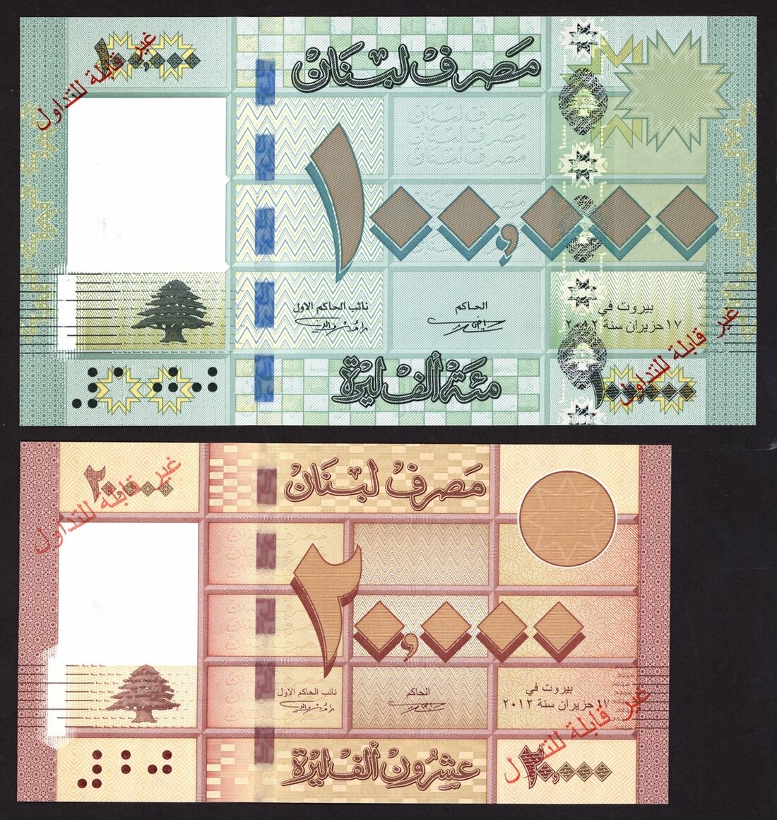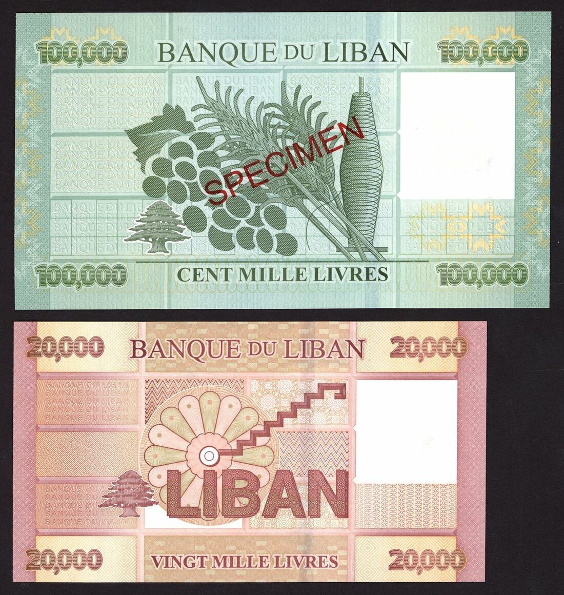 Banque du Liban, specimen 20000 livres, 2012, pink-brown and specimen 100000 livres, 2012, green-blue, cedar tree low left
