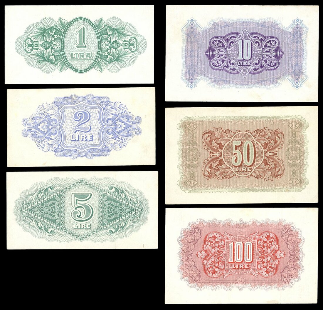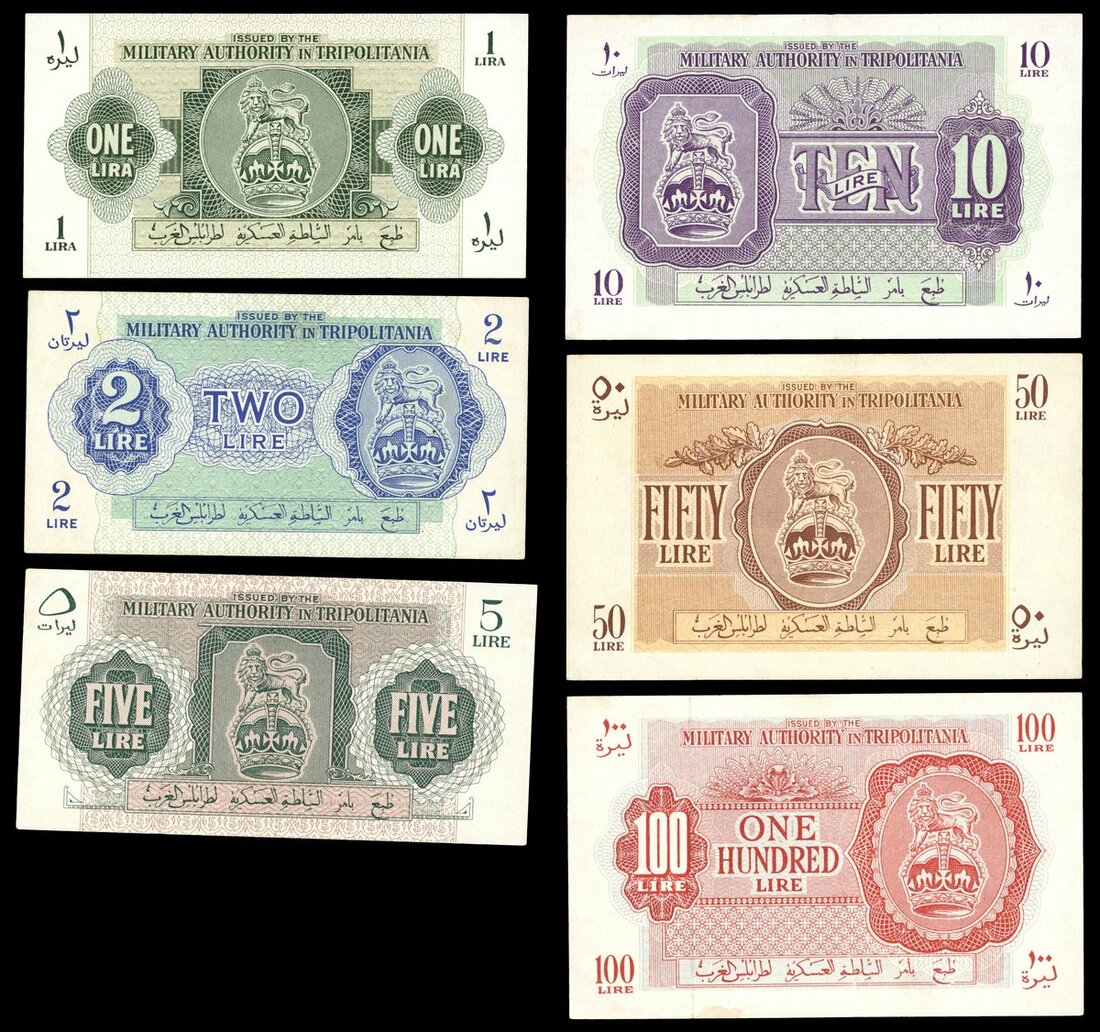 Military Authority in Tripolitania, 1, 2, 5, 10, 50 and 100 lire, 1943, (Pick M1-M6, TBB B001-B006), pressed, extremely fine (6 notes)