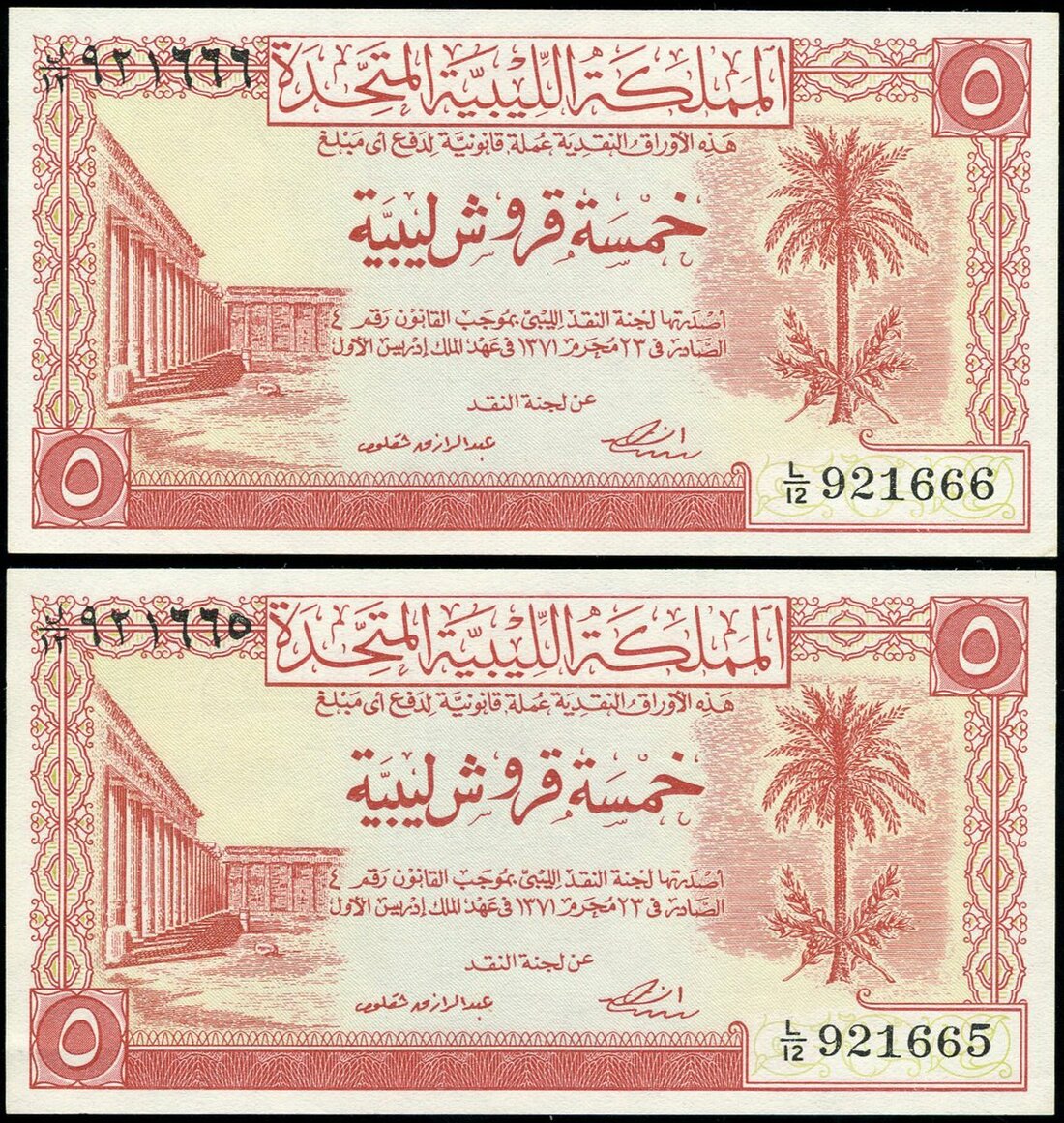 (x) United Kingdom of Libya, consecutive 5 piastres (2), 1951, serial numbers L/12 921665/666, red and pale green, arms at right, colonnade at left