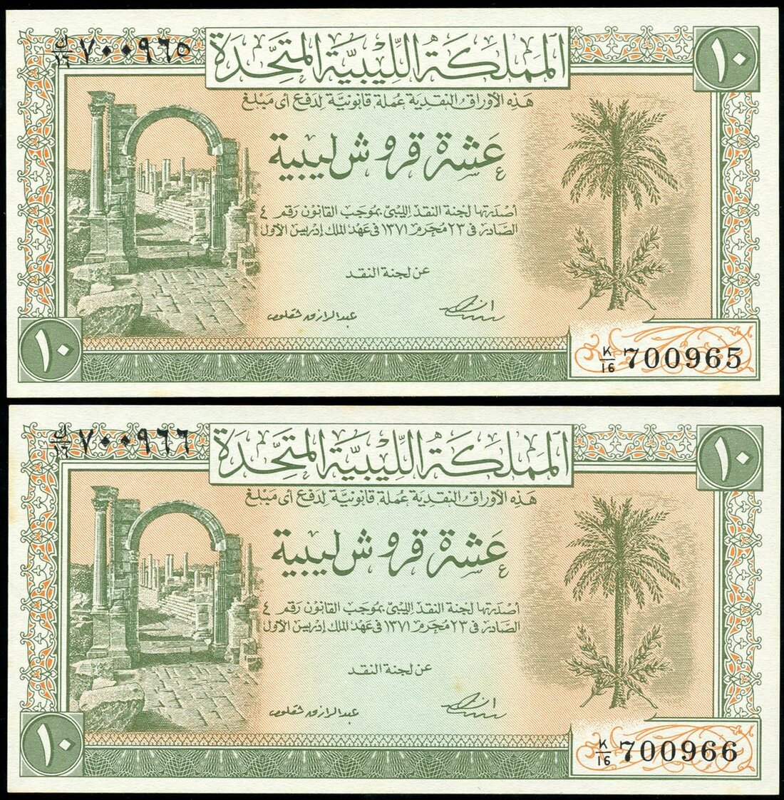 (x) United Kingdom of Libya, 10 piastres (2), 1951, serial numbers K/16 700965/966, green and pale pink, arms at right, arch at left