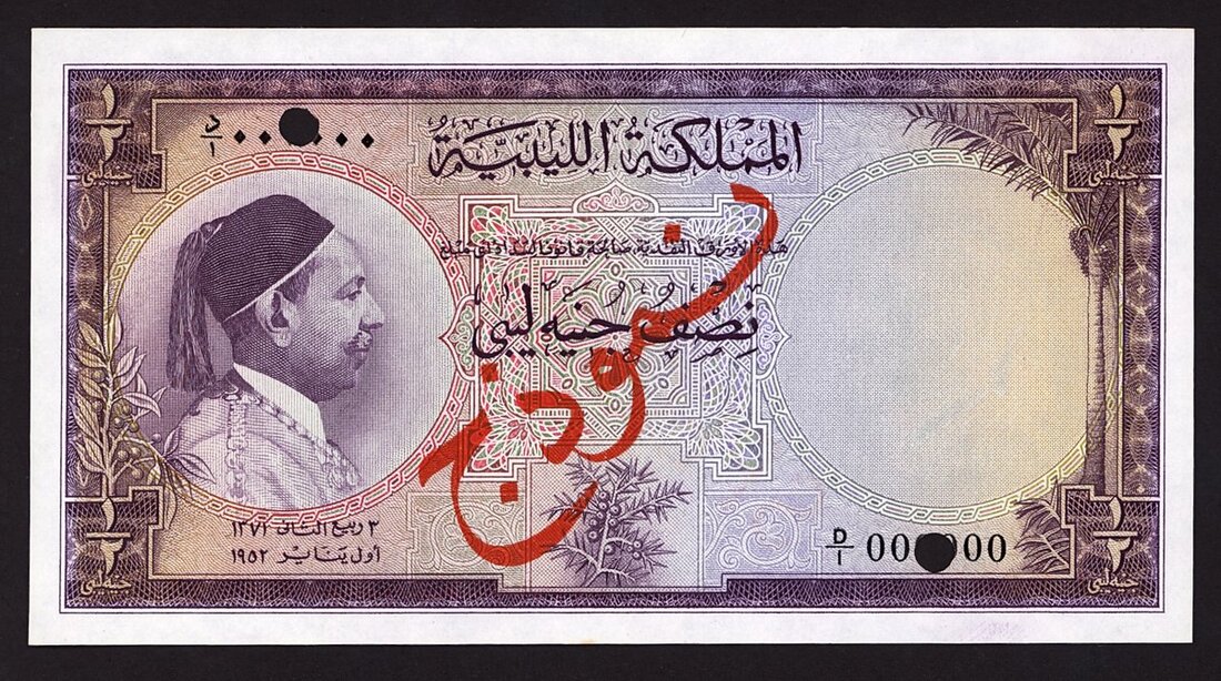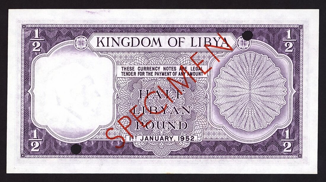 Kingdom of Libya, specimen 1/2 dinar, 1952, (Pick 15s, TBB B104as1), Uncirculated