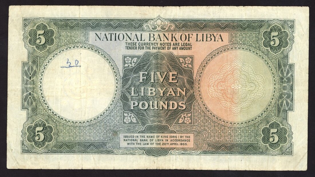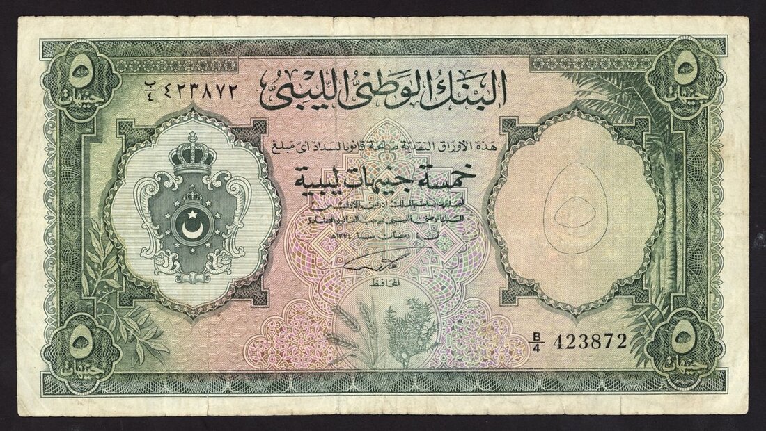 Nation Bank of Libya, 5 Libyan pounds, ND (1963), serial number B/4 423872, (Pick 21) fine