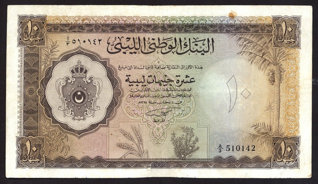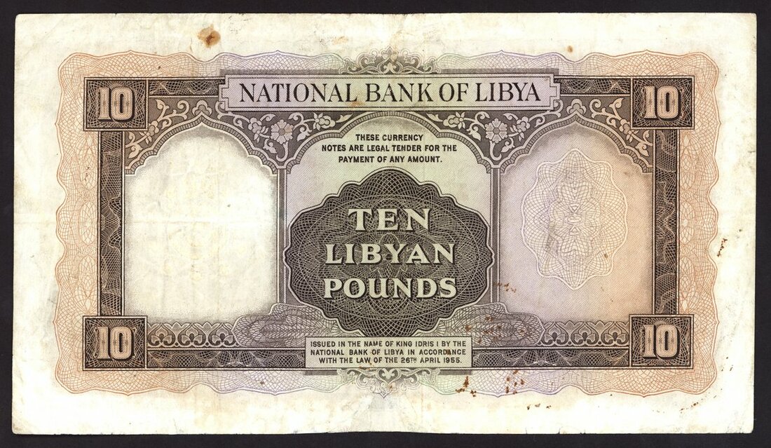 National bank of Libya, £10, 1963, serial number brown on multicolour underprint, arms at left, value in each corner and at right, reverse, guilloche patterns