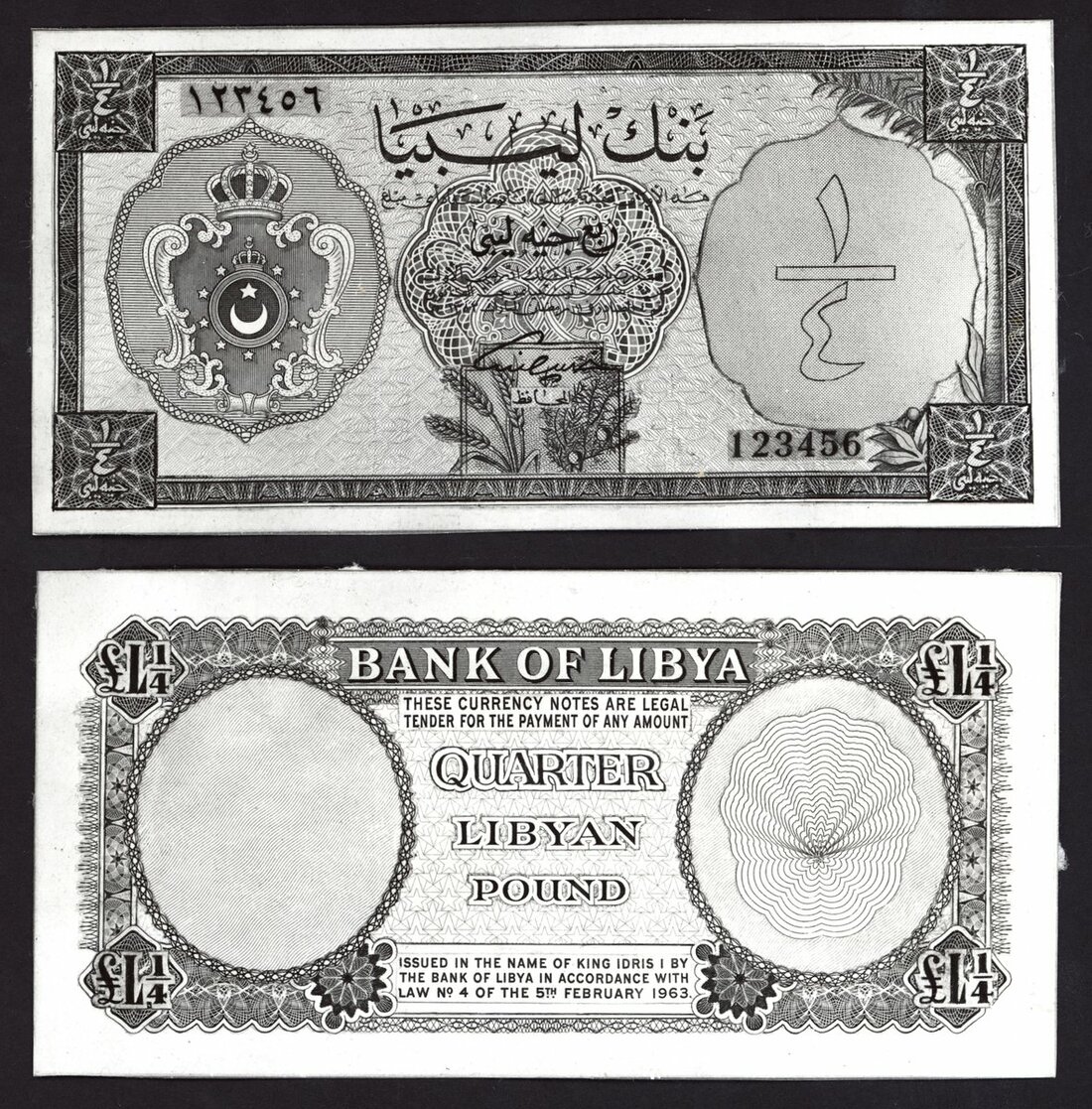 Bank of Libya, obverse and reverse printer's archival photographs for £1/4, ND (1965), (Pick 23 for type), some mounting traces at the back, no damage to the design (2 notes)