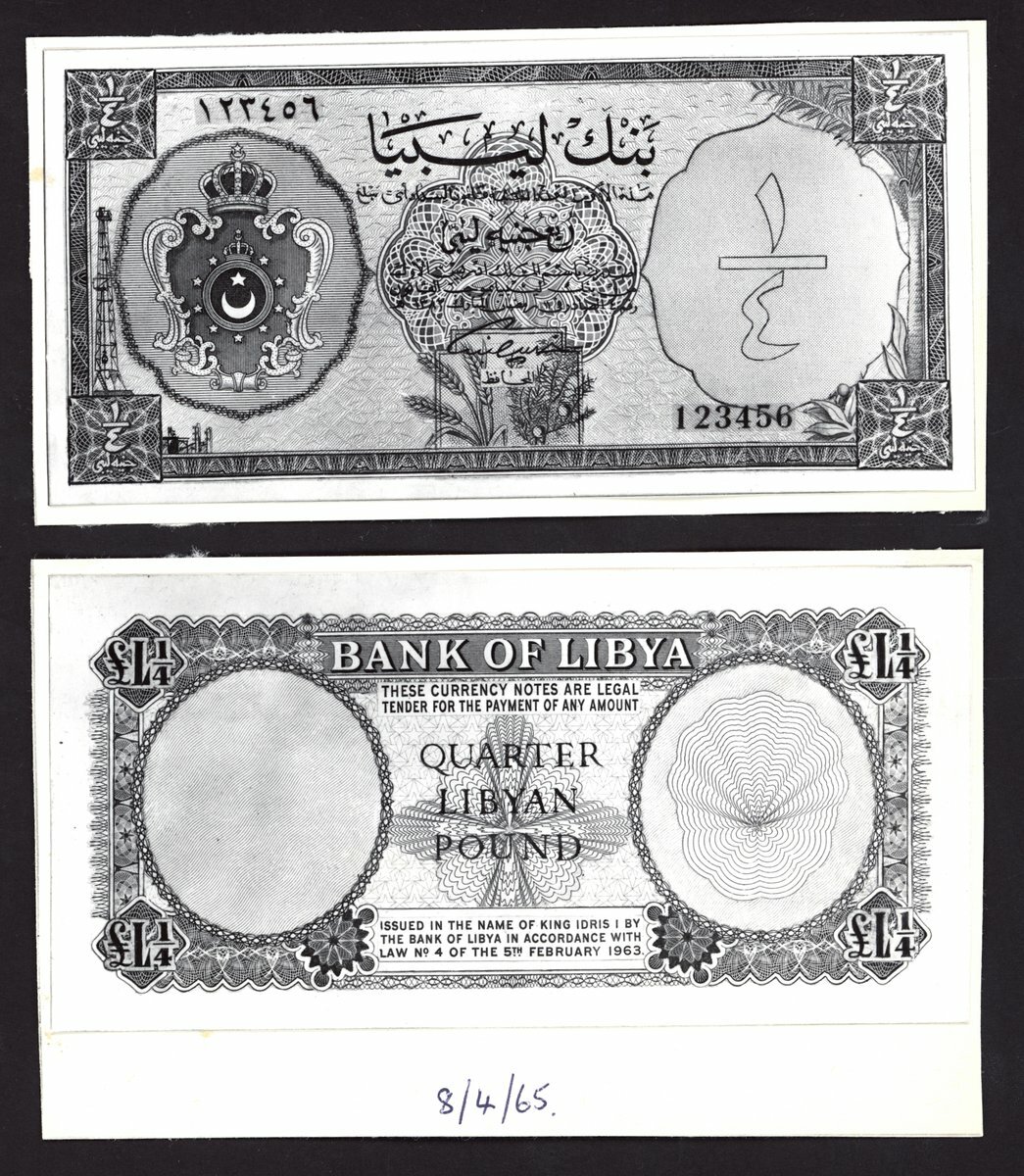 Bank of Libya, obverse and reverse printer's archival photograph for an unissued design £1/4, ND (1965), oil rig at left which is not included in the issued design, different fonts on the reverse design,