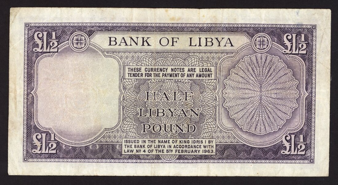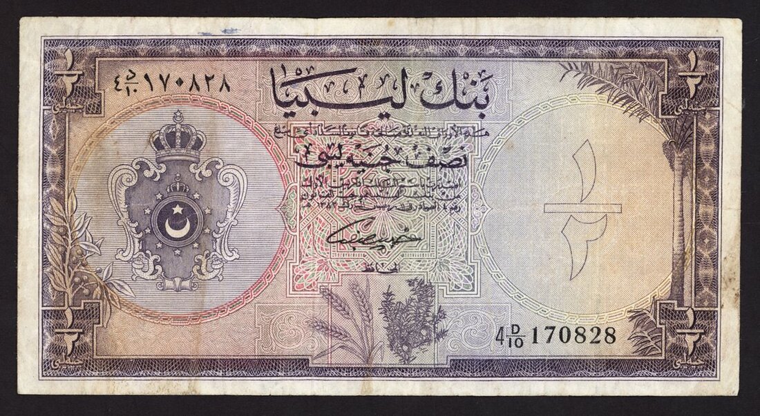 Bank of Libya, £1/2, ND (1963), serial number purple on multicolour underprint, arms at left, value at right and each corner
