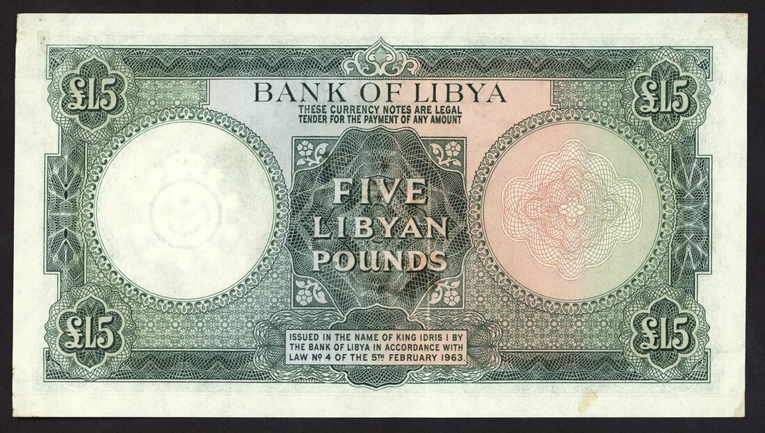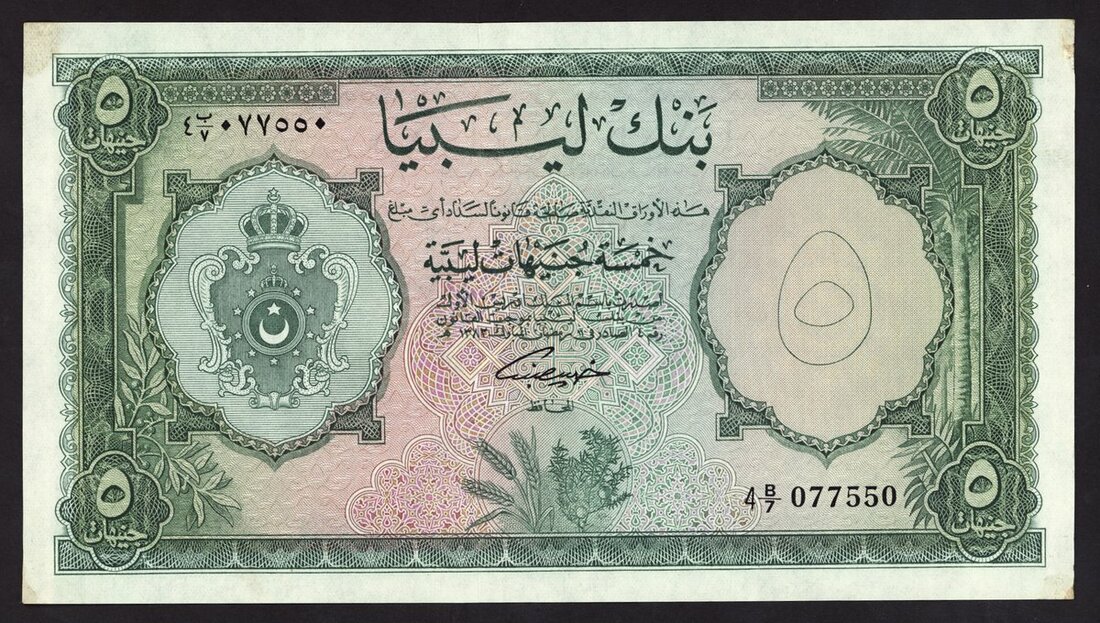 Bank of Libya, 5 Libyan pounds, ND (1963), serial number 4B/11 254241, (Pick 26) good extremely fine
