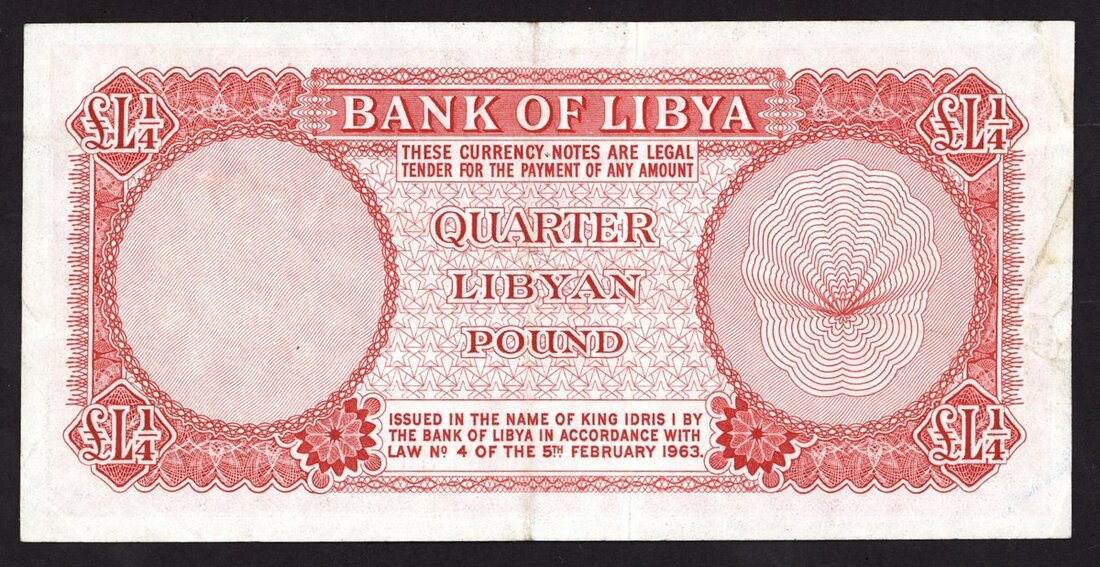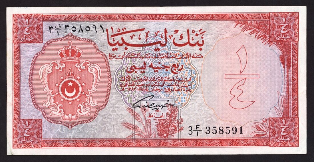 Bank of Libya, 1/4 Libyan pound, '1963 Second Issues', serial number, (Pick 28, TBB B406), about extremely fine