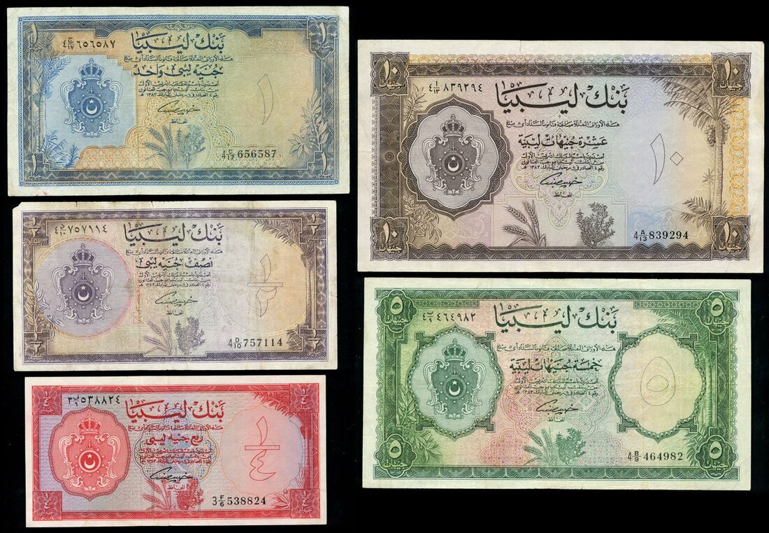(x) Bank of Libya, 5 pounds, 1963, prefix 4 B/9, green, arms at left, value at right