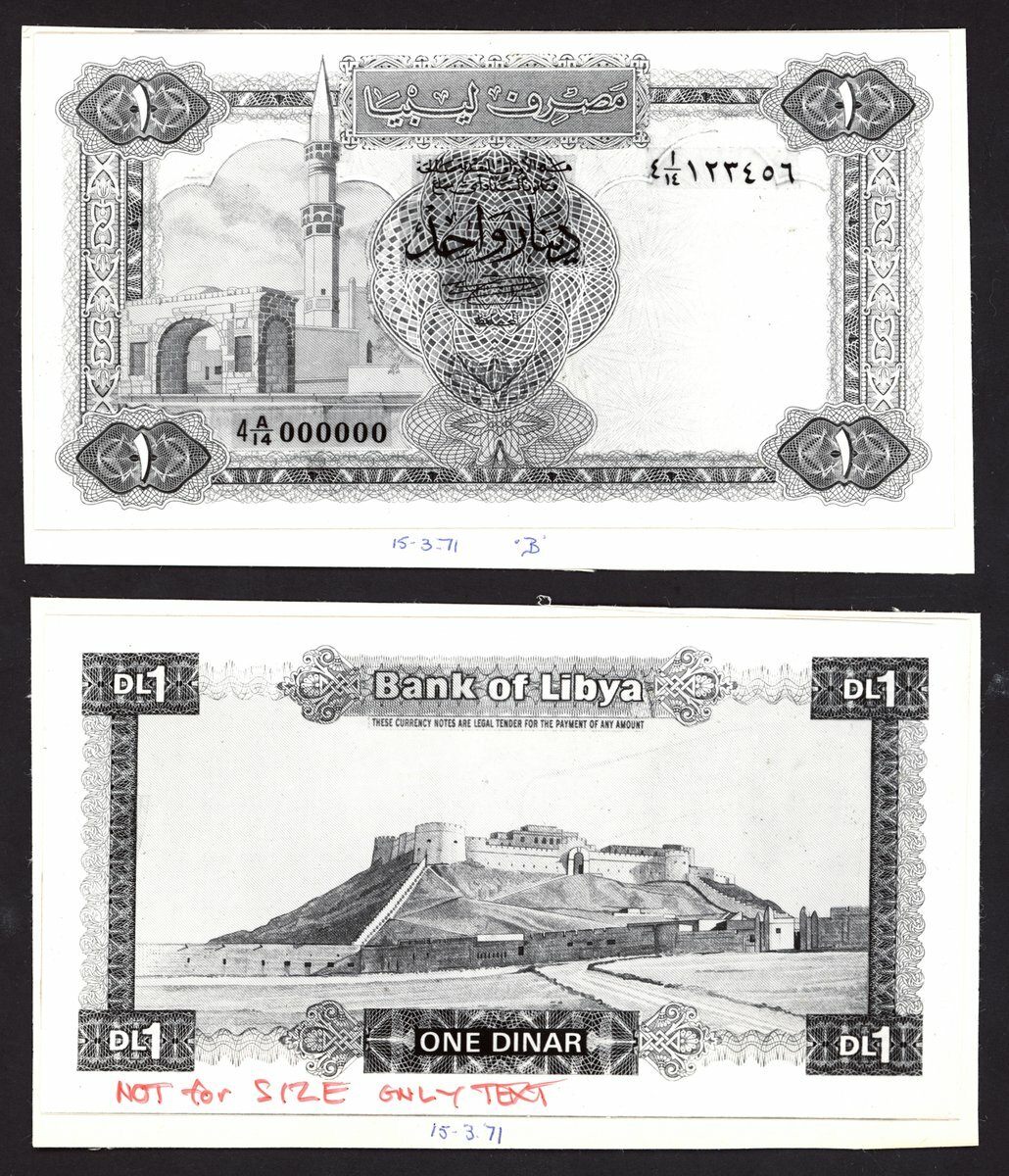 Bank of Libya, obverse and reverse printer's archival photograph for unissued 1 dinar, ND (1971), (Pick 35 for type), boarder and font different from issued note, both mounted on card, printer's annotations on reverse design, rare and interesting (2 notes)