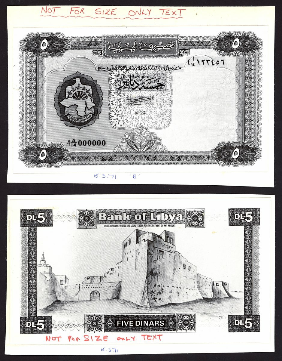 Bank of Libya, obverse and reverse archival photographs for 5 dinars, ND (1971), (Pick 36 for type), boarder and font different from issued note. Both mounted on card, printer's annotations on reverse design. Interesting (2 notes)
