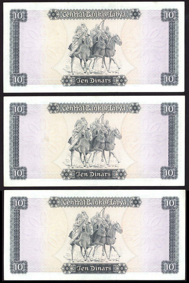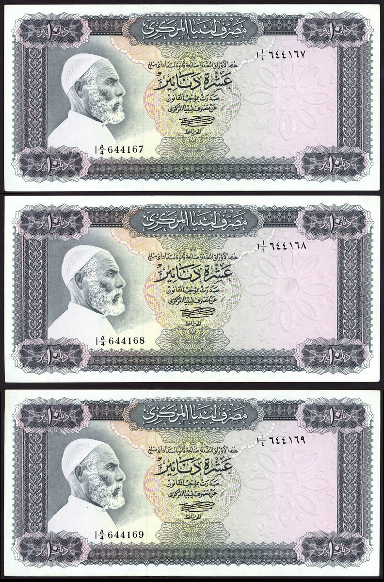 (x) Central Bank of Libya, consecutive 10 dinars, ND 1972, serial number 1A/4 644167-69, (Pick 37a, TBB B505a), without inscription, about uncirculated (3 notes)
