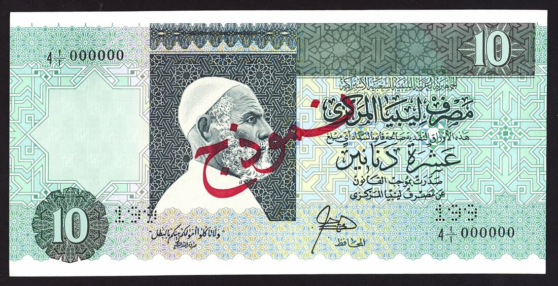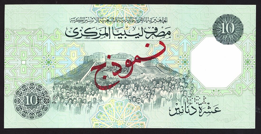 Central Bank of Libya, specimen 10 dinars, ND (1989), (Pick 56s, TBB B520s), folder at right edge, otherwise about uncirculated