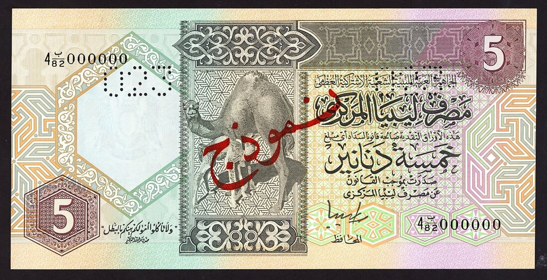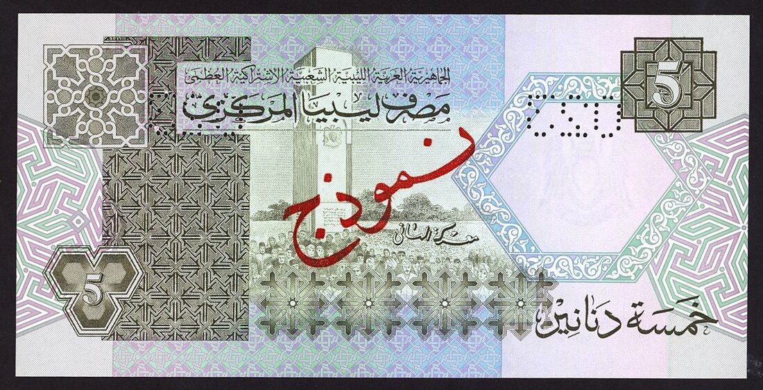 Central Bank of Libya, specimen 5 dinars, ND (1991), (Pick 60s, TBB B524s) interestingly unrecorded prefix in Linzmayer, Uncirculated