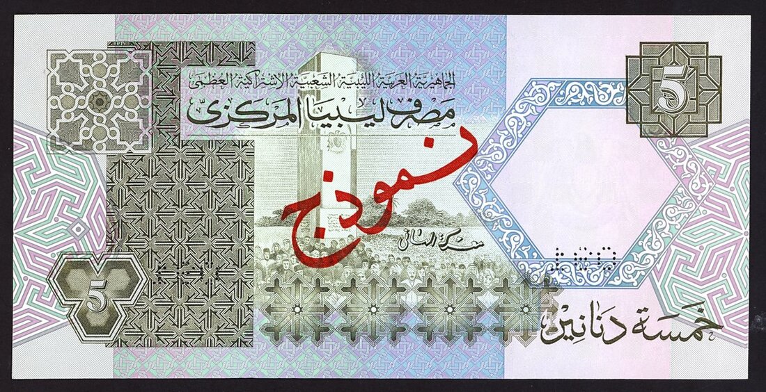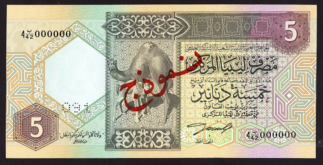 Central Bank of Libya, specimen 5 dinars, ND (1991), (Pick 60s, TBB B524bs), folder at left edge, otherwise about uncirculated