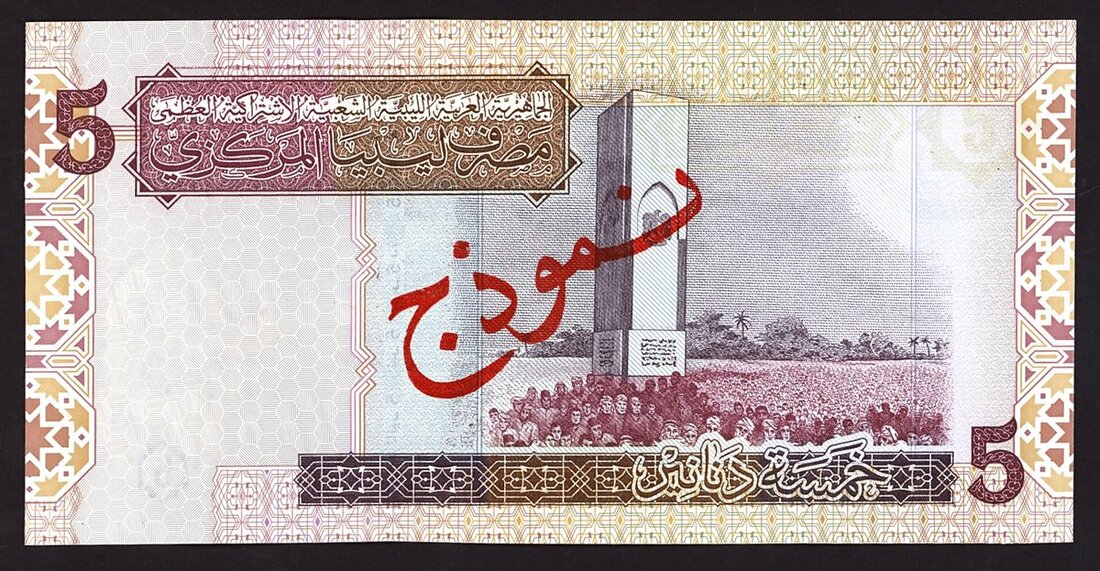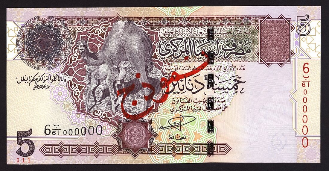 Central Bank of Libya, specimen 5 dinars, ND (2002-08), (Pick 69s, TBB B532s), uncirculated