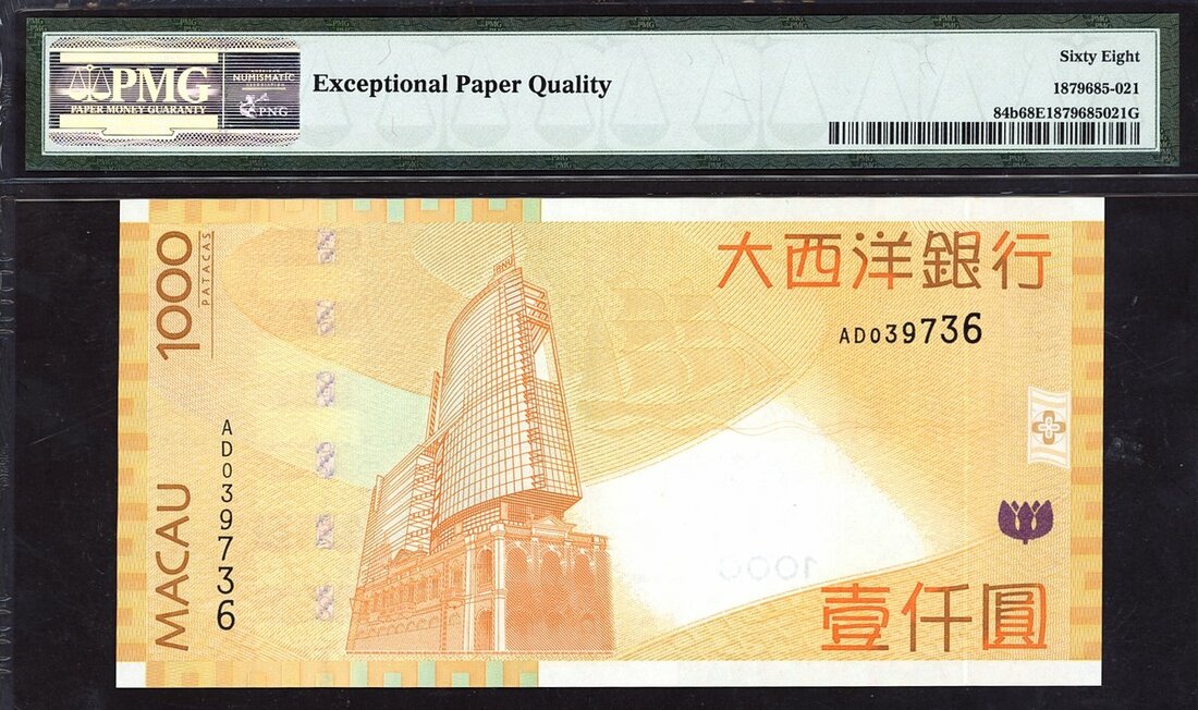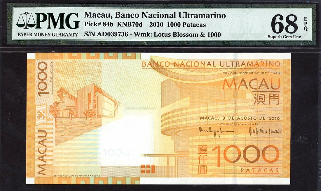 (x) Banco Nacional Ultramarino, Macau, 100 patacas, 8 August 2010, serial number AD 039736, (Pick 84d), in PMG holder 68 EPQ Superb Gem Unc