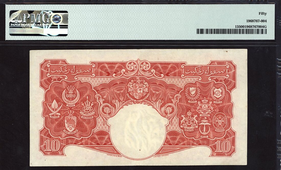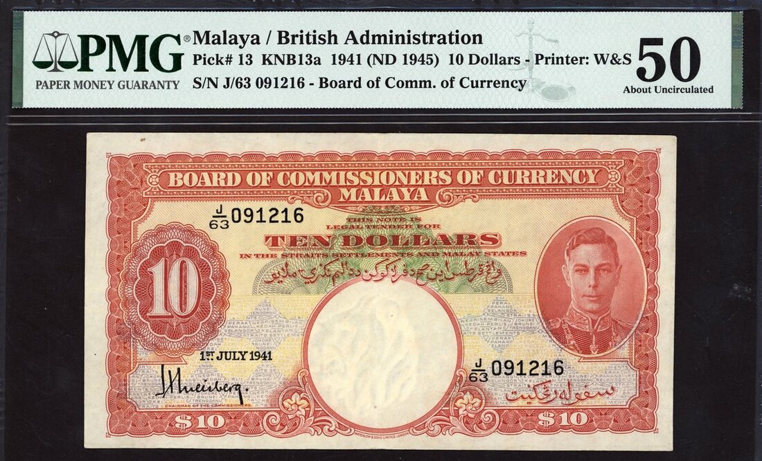 Board of Commissioners of Currency, Malaya, $10, 1 July 1941, serial number J/63 091216, (Pick 13, TBB B114), in PMG holder 50 About Uncirculated, scarce